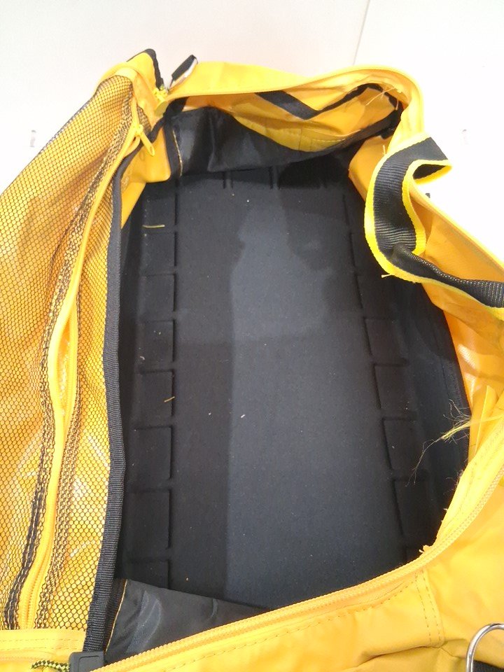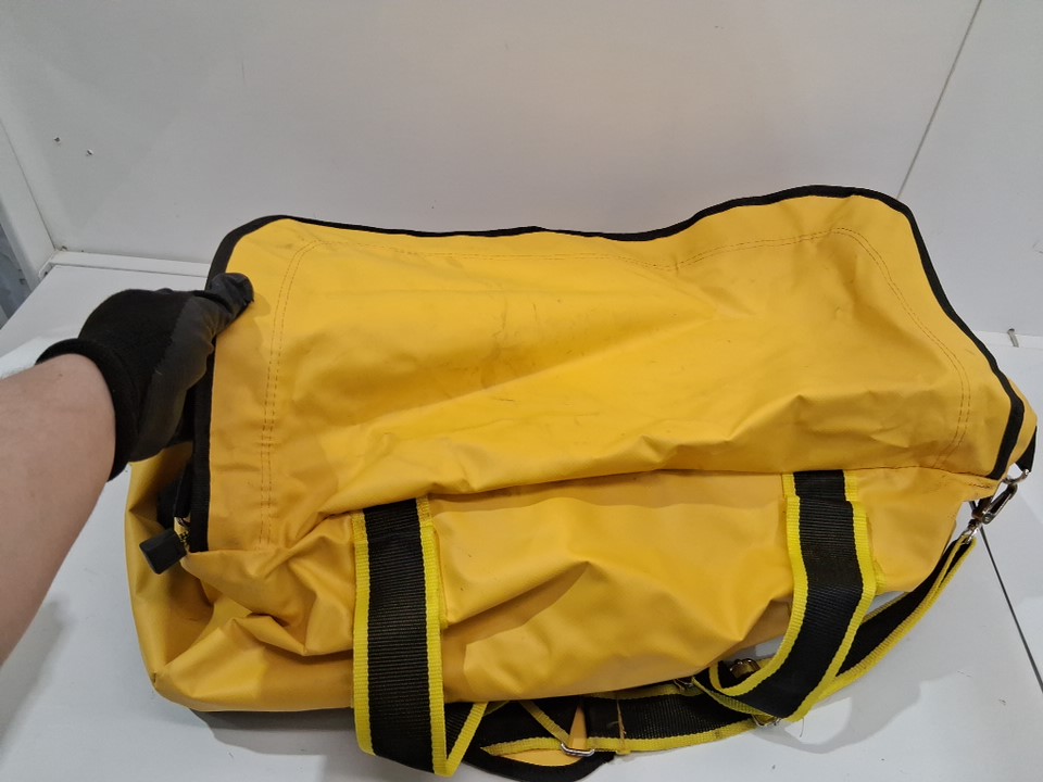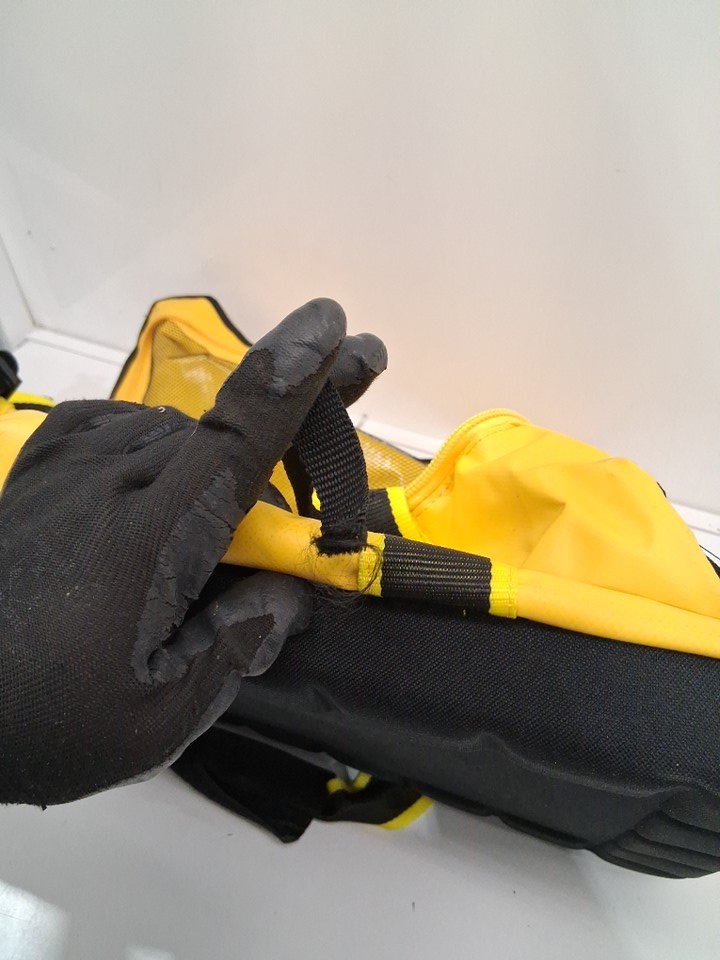 Bag has some light fraying inside and one of the small outer straps is snapped