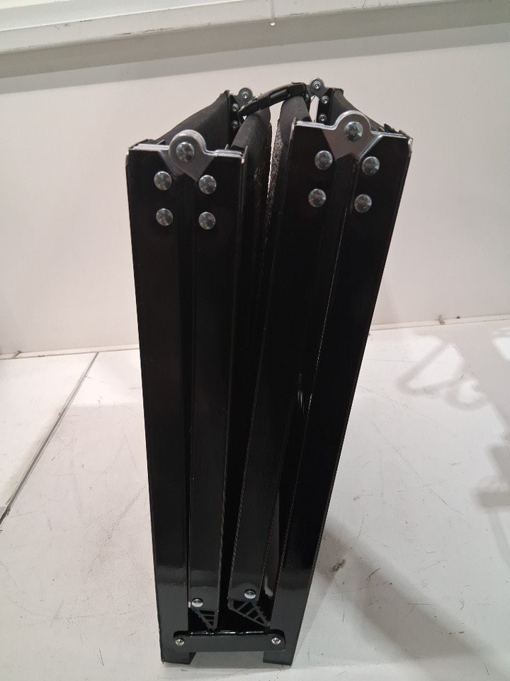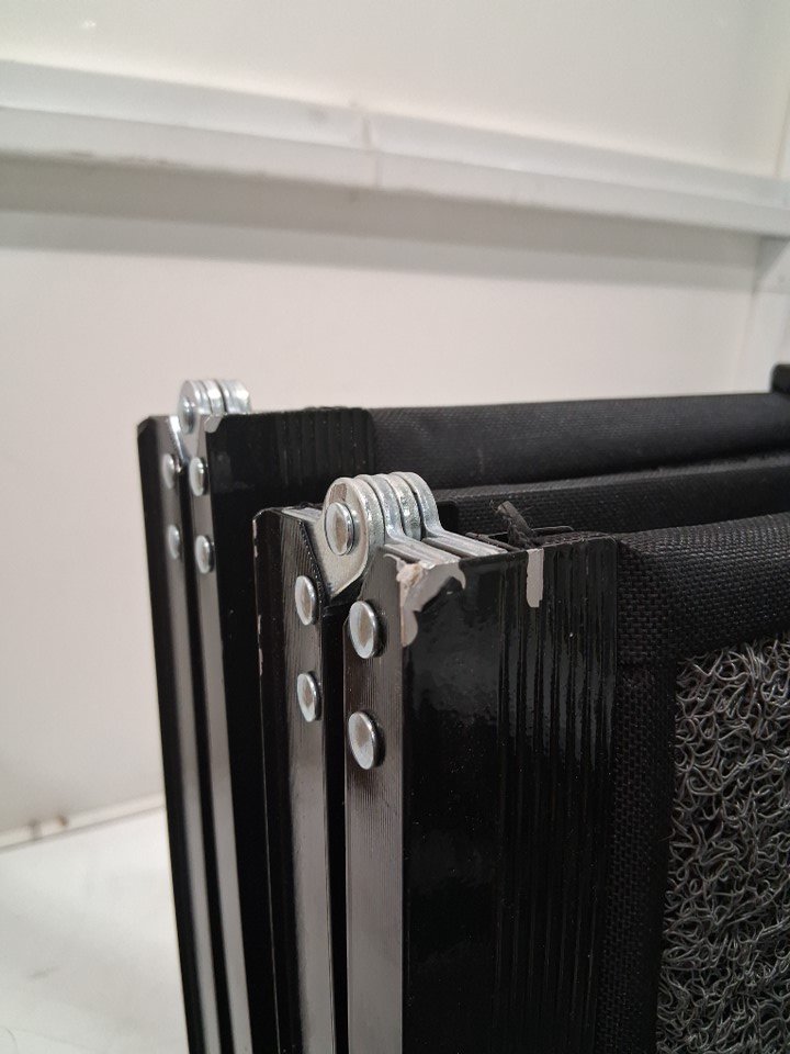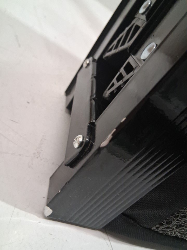 upon inspection it was noted that this product does have some paint peeling which seems to be only cosmetic. there is a minor bend in the metal of the corners edges that is noticeable when the product is folded.