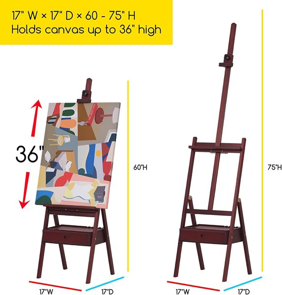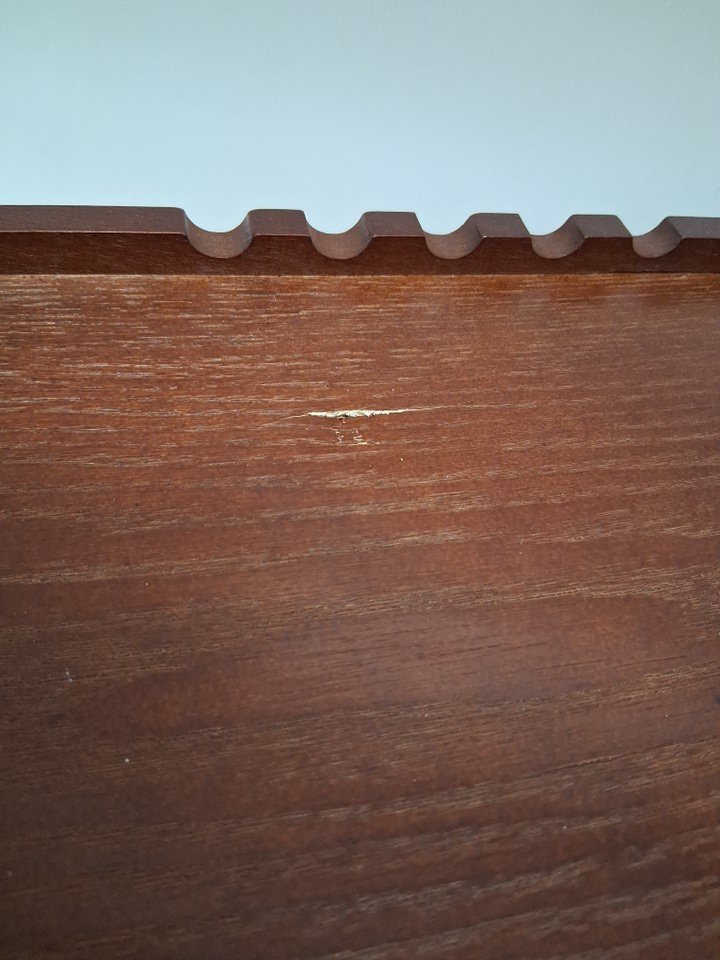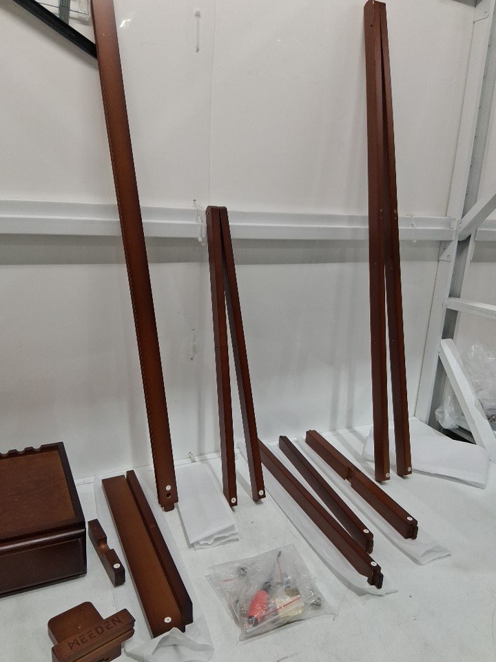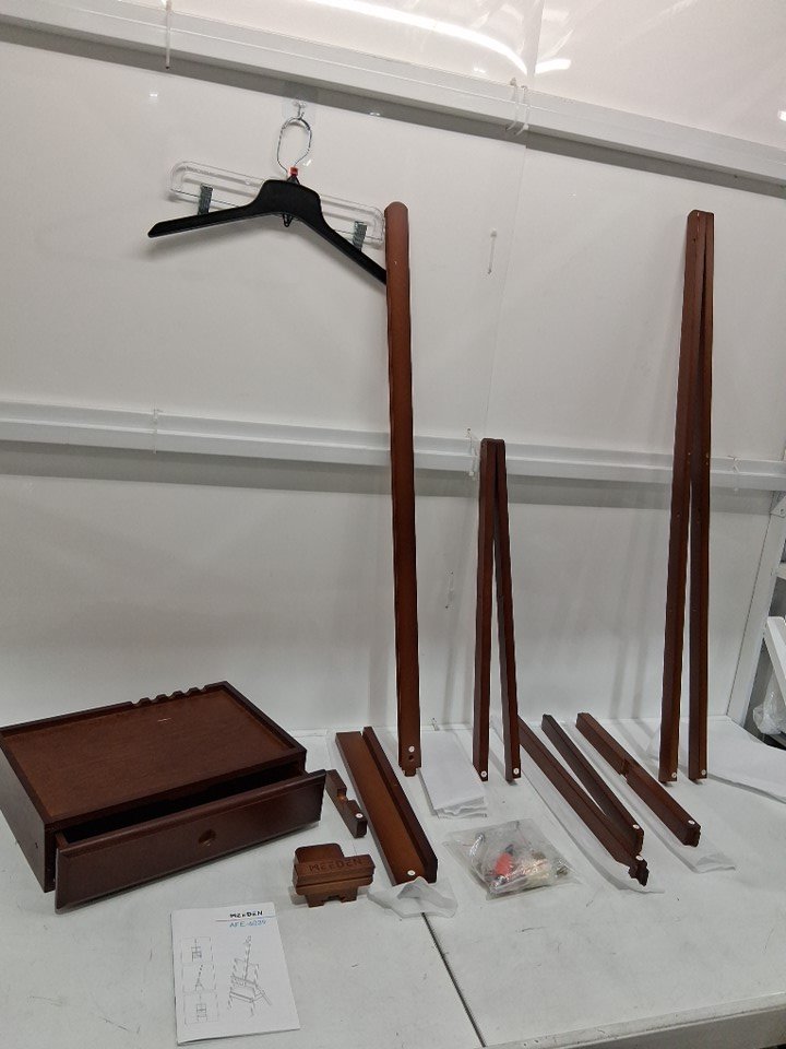 There is a small dent in the top of the drawer that seemed to have happened during shipping (the box is damaged right where the dent in the drawer is), and there's little mark ups around the legs of the easel, as well as signs it was partially assembled. See image details.