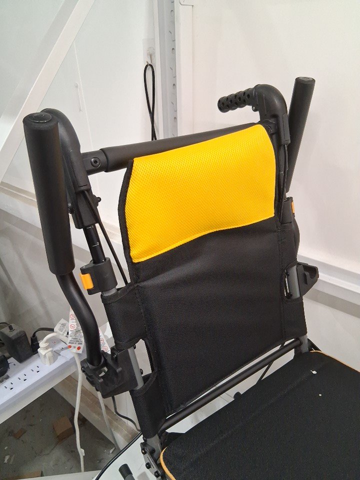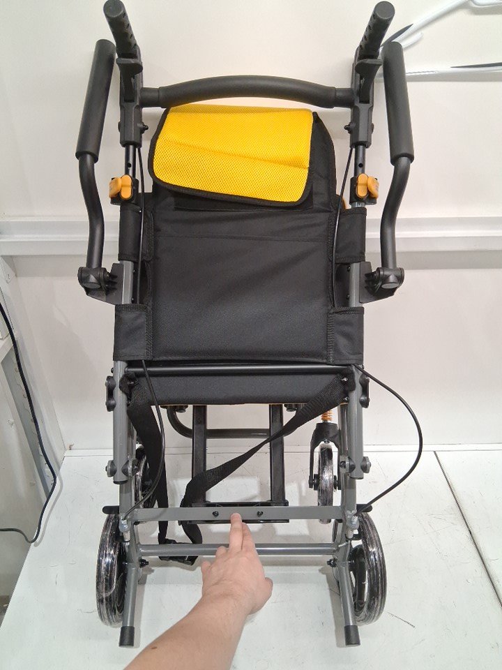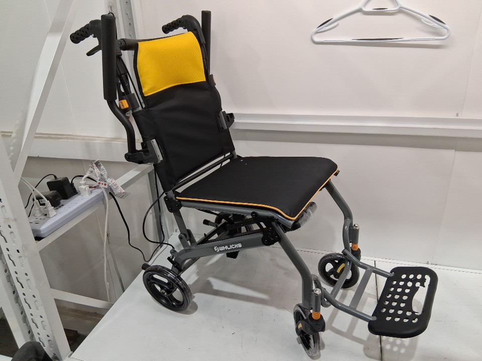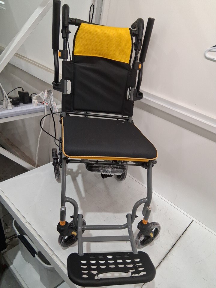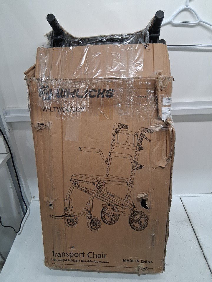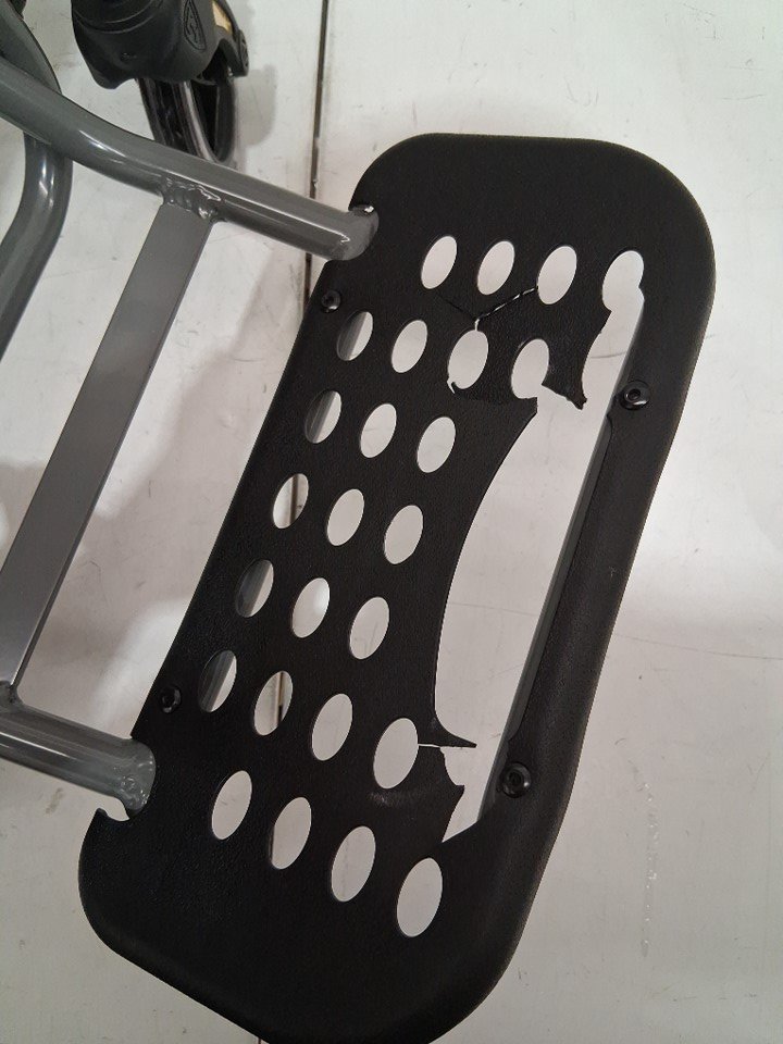 Foot rest is cracked/Chipped, missing plastic pieces. Wheel on ine side is Slightly bent, whole of wheelchair still functional. See photos