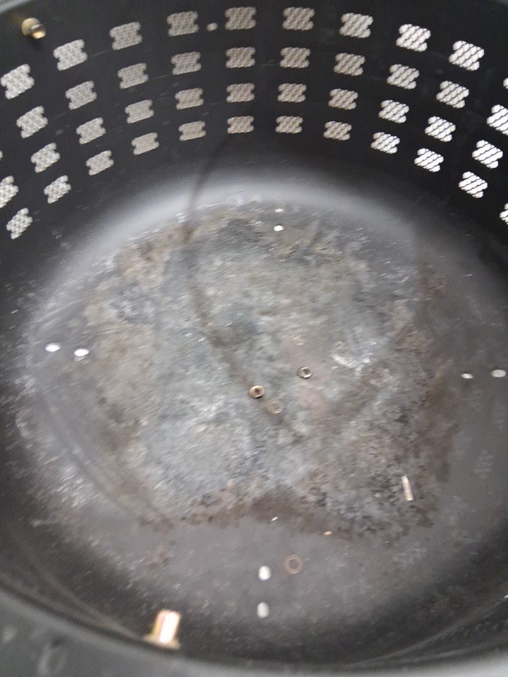 burnt/ashy bottom, rusted. no hardware
