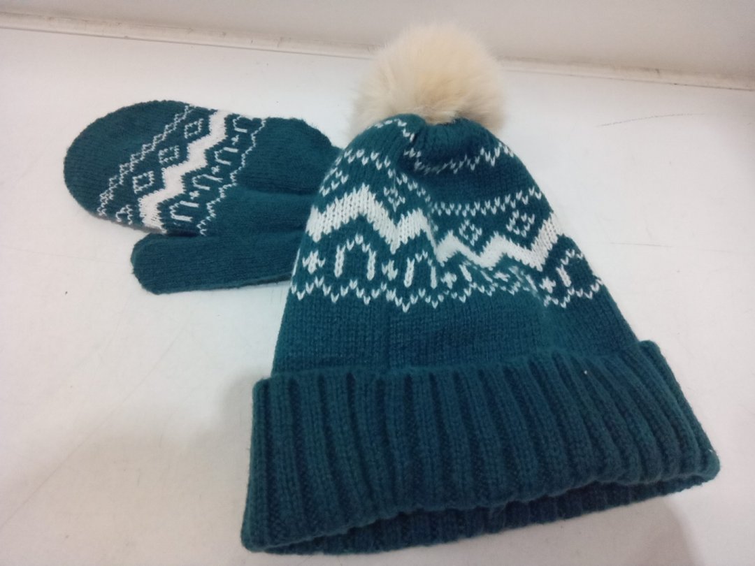 2PC Knitted Winter Toque with Pompom and Mittens Set - Teal/White