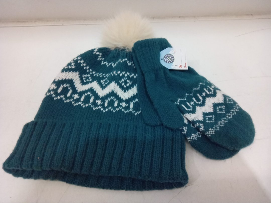 2PC Knitted Winter Toque with Pompom and Mittens Set - Teal/White