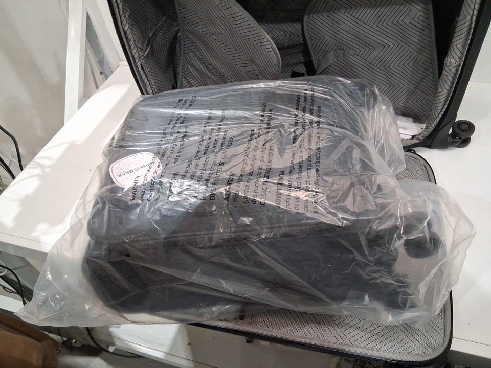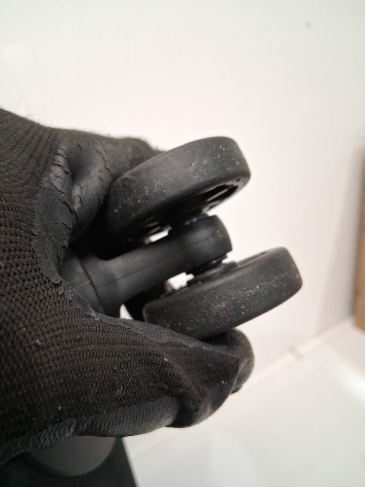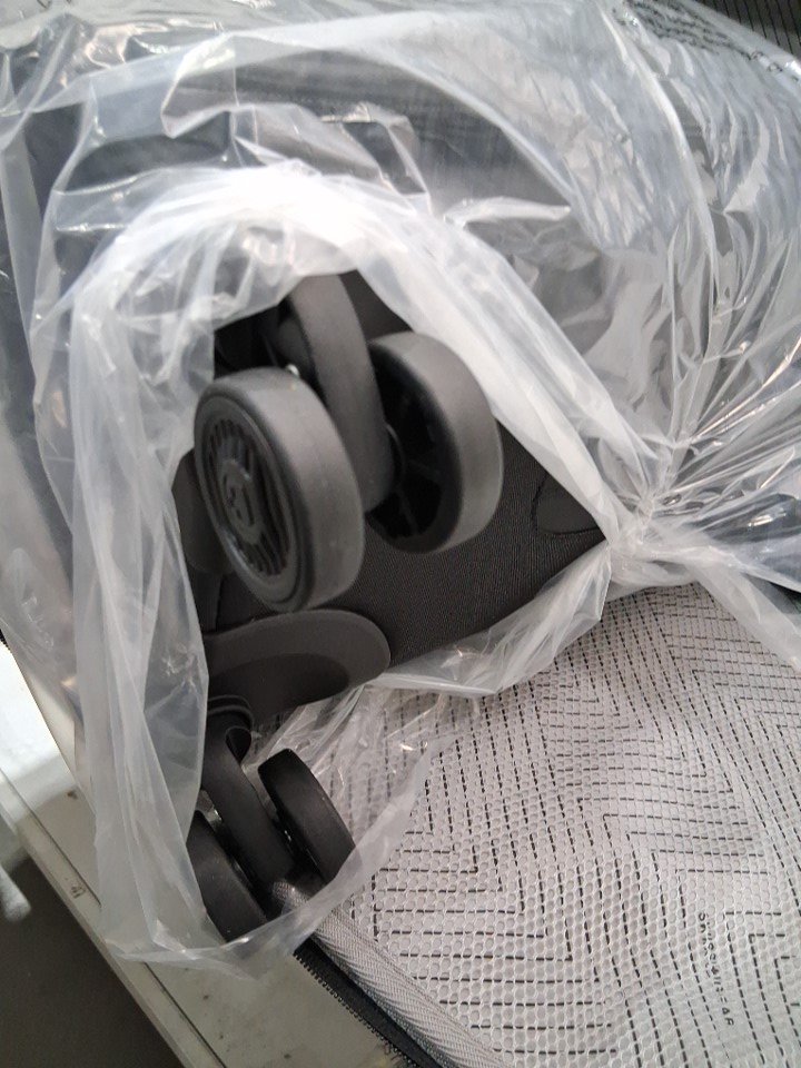 Larger spinner has some dirt on the wheels we can't easily wipe off, but smaller spinner inside is still in packaging and wheels are clean