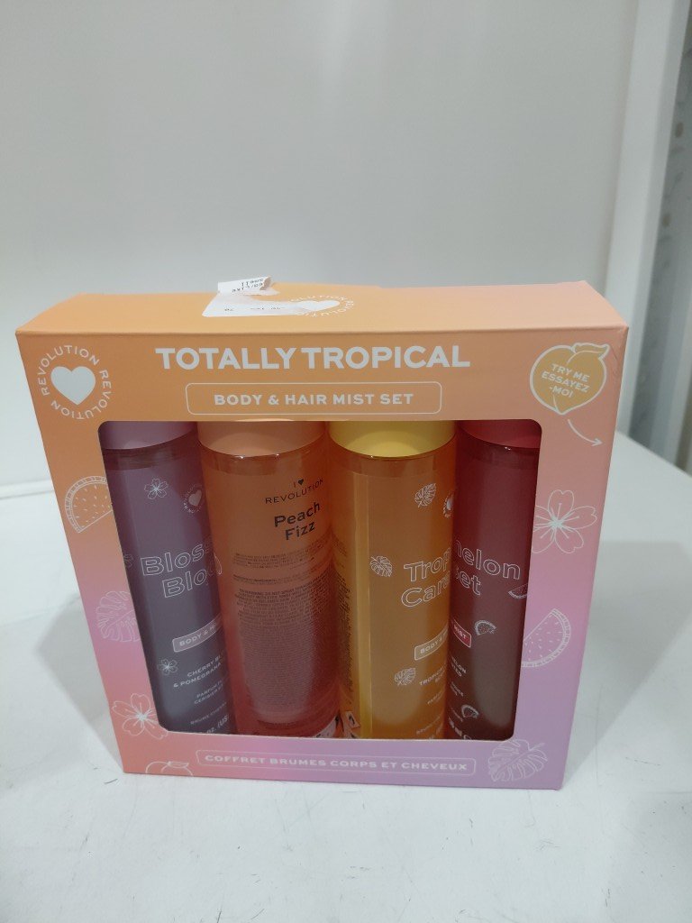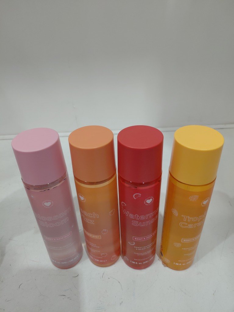 4pk Revolution I Heart Totally Tropical Body/hair Mist Set - 7.98oz/bottle - fresh peach/sweet watermelon & berry/Tropical Caramel/Blossom Bloom