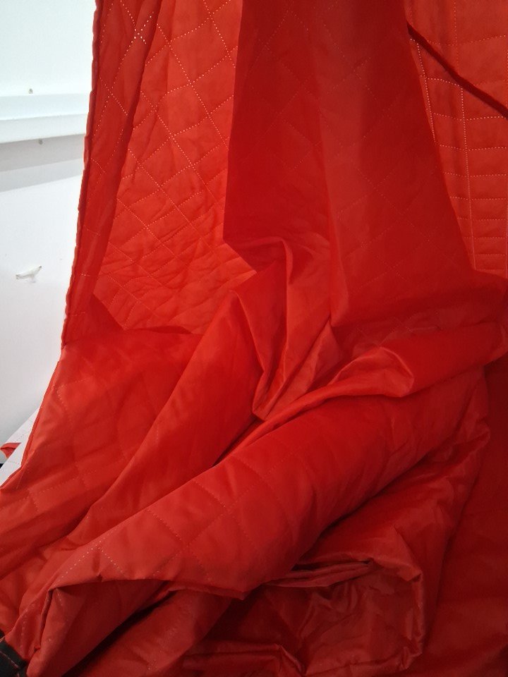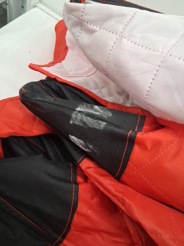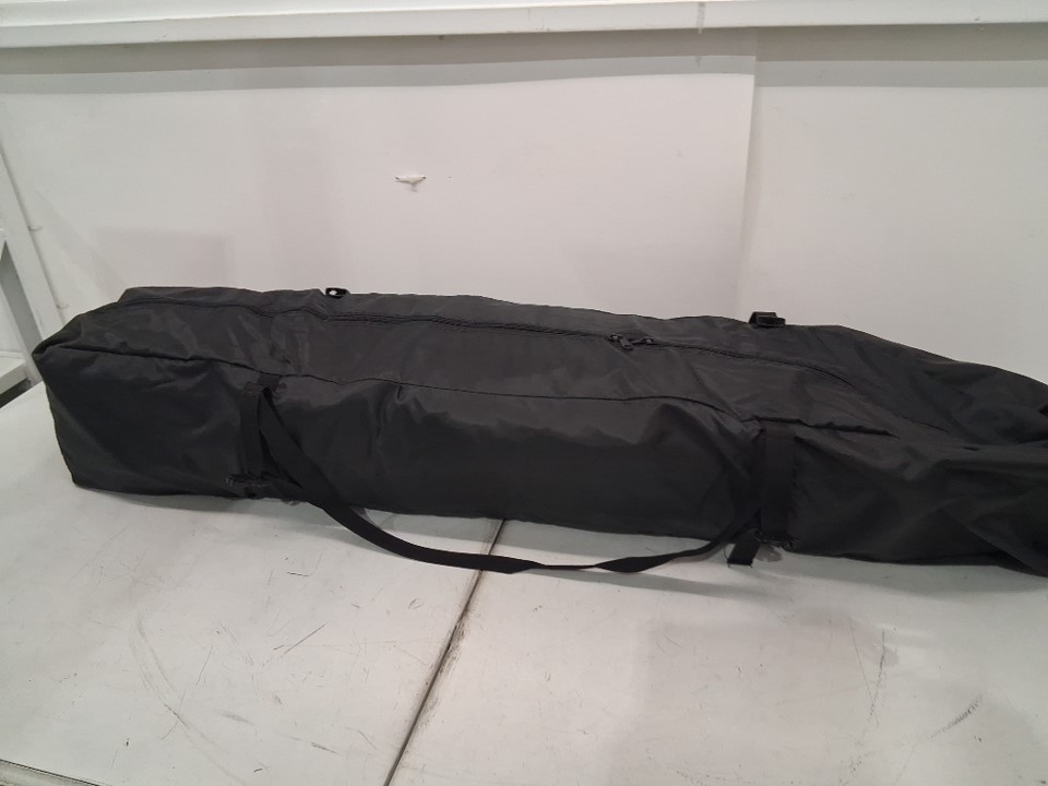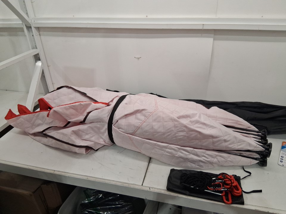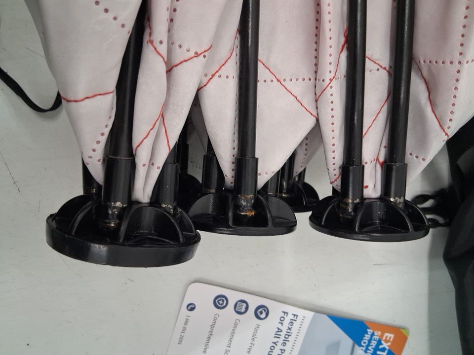 Feet of tent has paint chipped and light rust discoloration. Some parts of fabric on tent have white residue stains