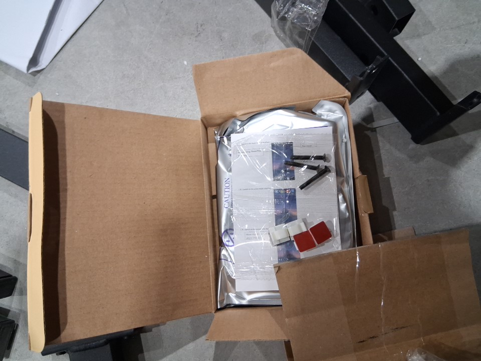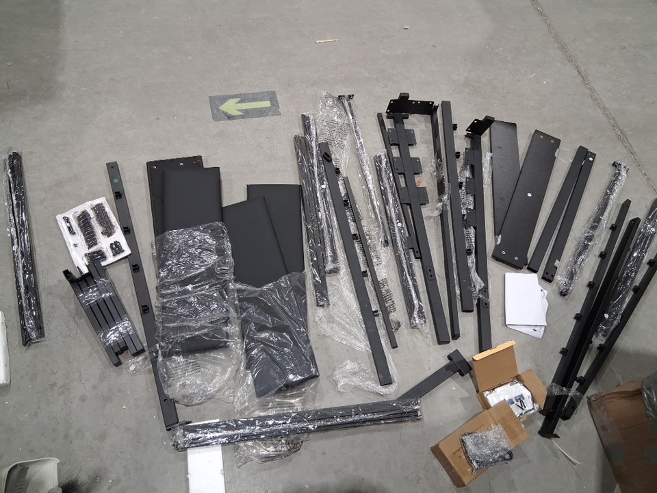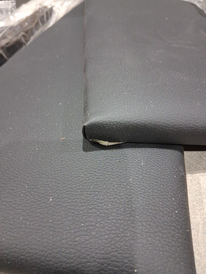 Small signs of attempted assembly present but many of the parts are still sealed in packaging. One of the upholstered panels has a small cut on the side.