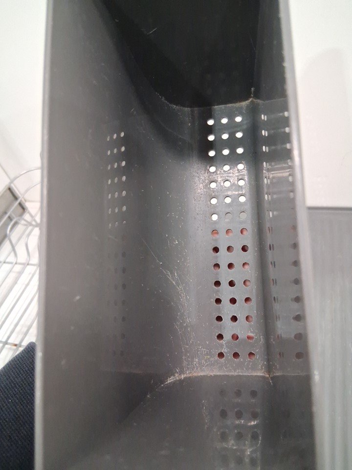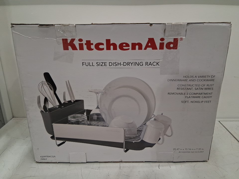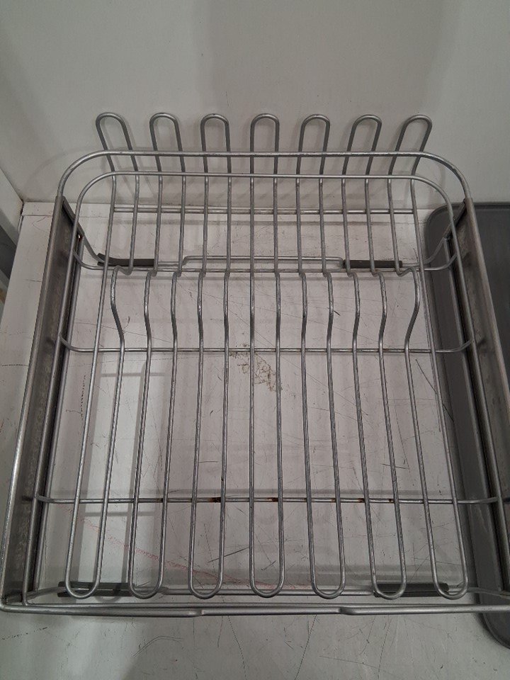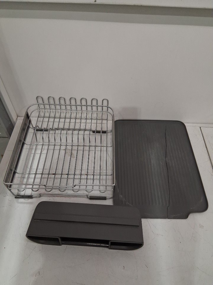 The mat for the dish rack was almost fully split in half during shipping and the rubber guards for the metal pieces that poke out at the one side of the dish rack are missing. Also, the utensil attachment has scratches in it and the dish rack has a bit of rust from previous use. (Please see photos)