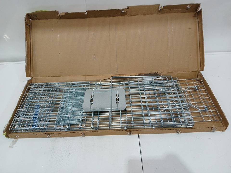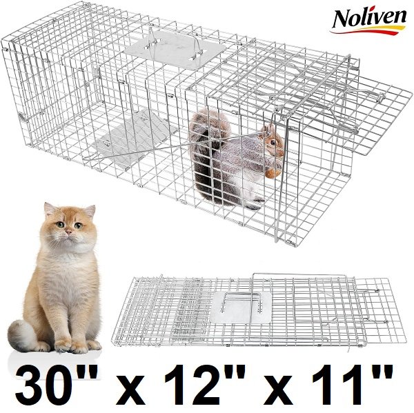 noliven live animal cage trap - humane metal cage for small stray dog, cat, raccoon, armadillo, fox, marmot and similar sized wildlife - 30" x 12" x 11" - silver