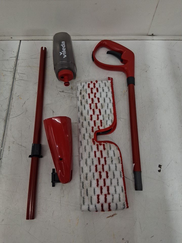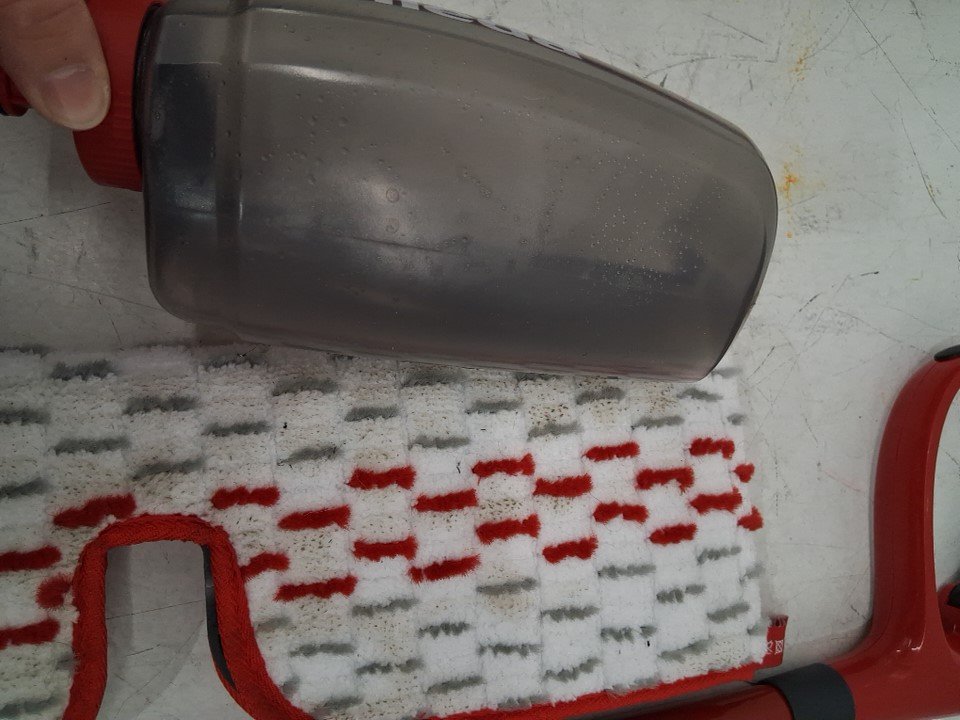 Fluid residue in the tank and dirt on the mop pad from prior use. See photos.