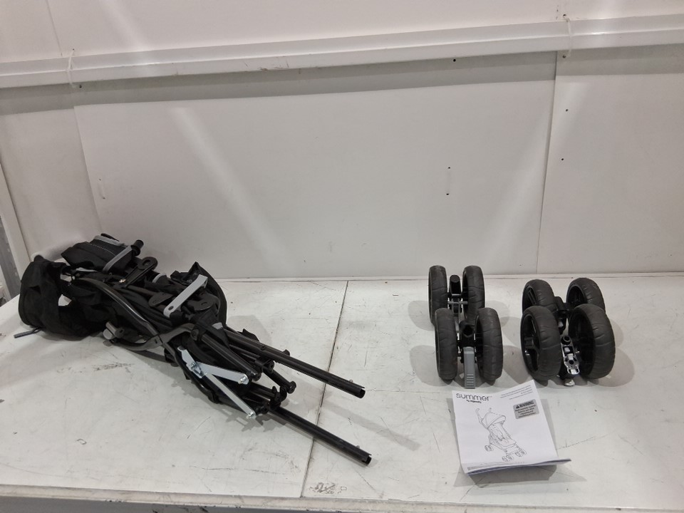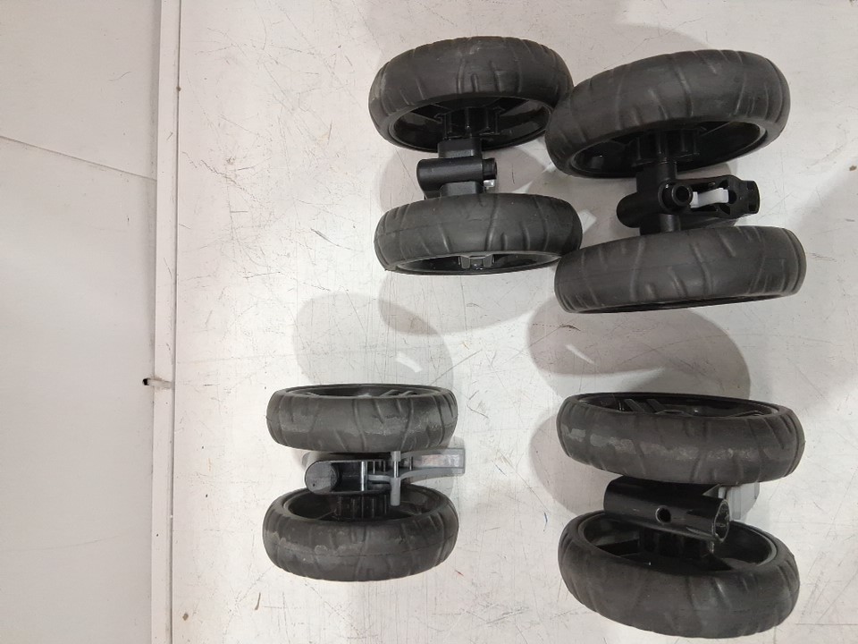 There is dirt residue on the wheels and dust residue on the stroller due to previous use. (Please see photos)