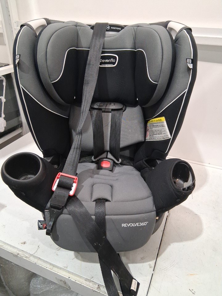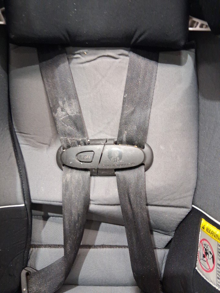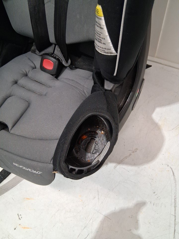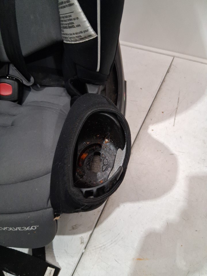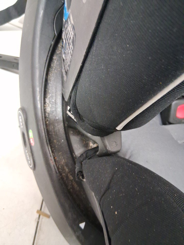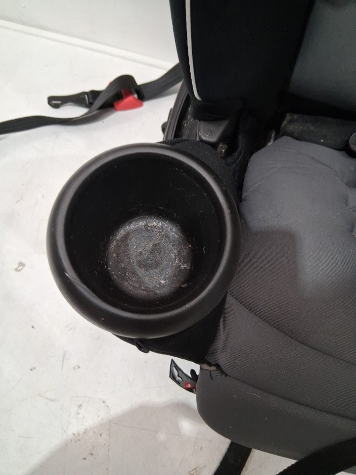 item is missing cup holder, has a rip in the seat fabric where legs hang over. item has crumbs and food residue all throughout car seat ( see photos)