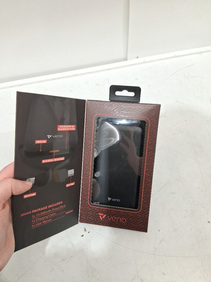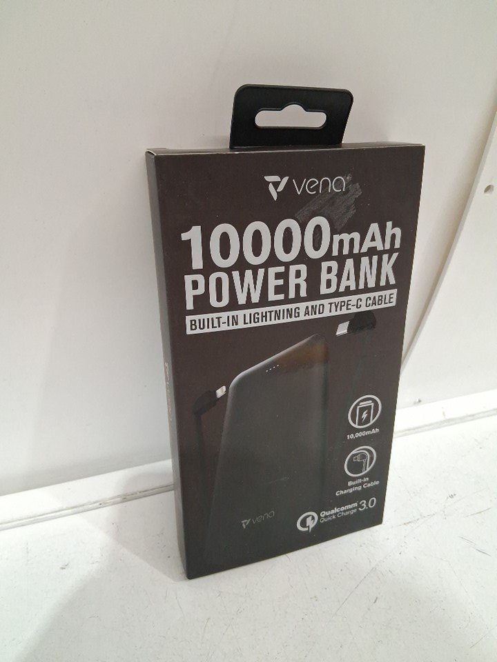 Vena Portable Battery Charger with Built-in USB-C & MFI Lightning Cable - 10,000mAh - 18w - black