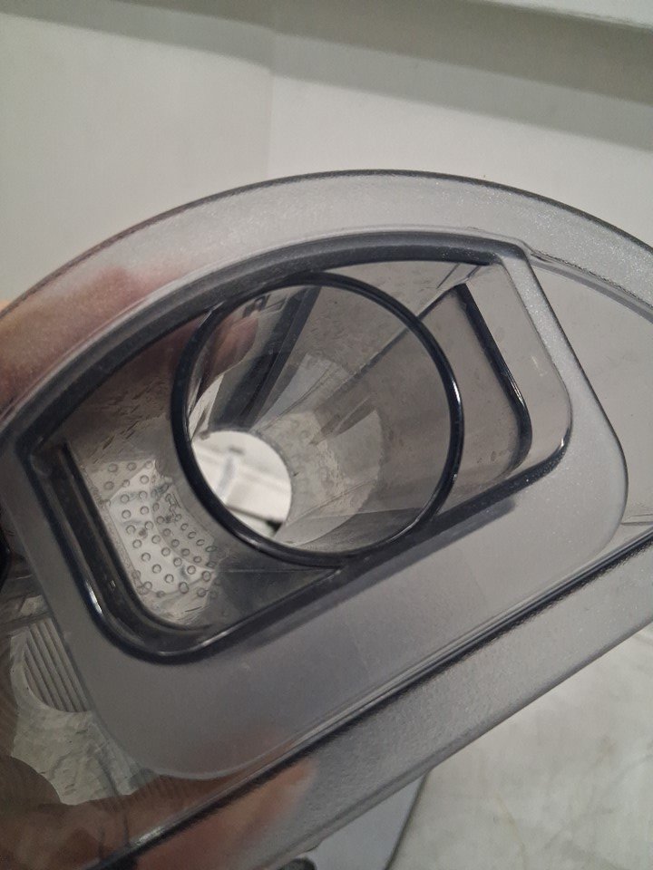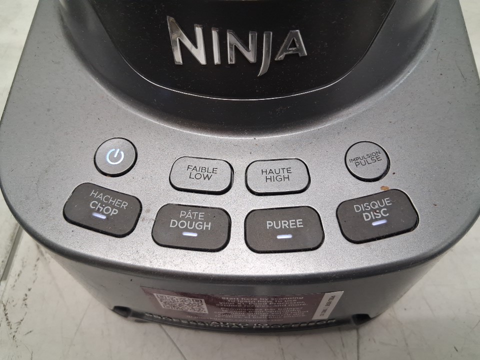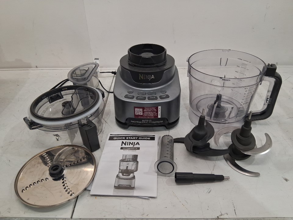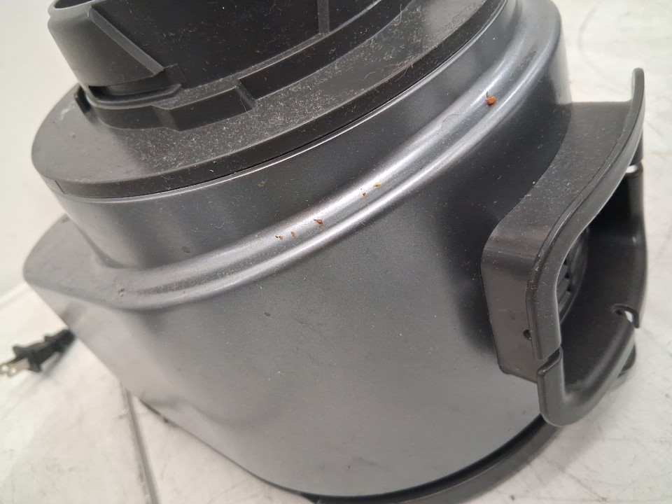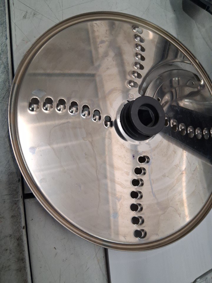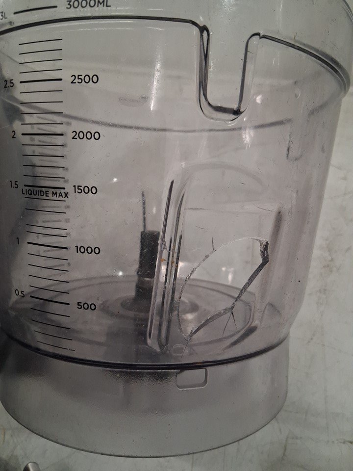 Hole on processing bowl, liquid residue on some attachments/blender base. Missing additional slicing disc and blade, item was tested for power.