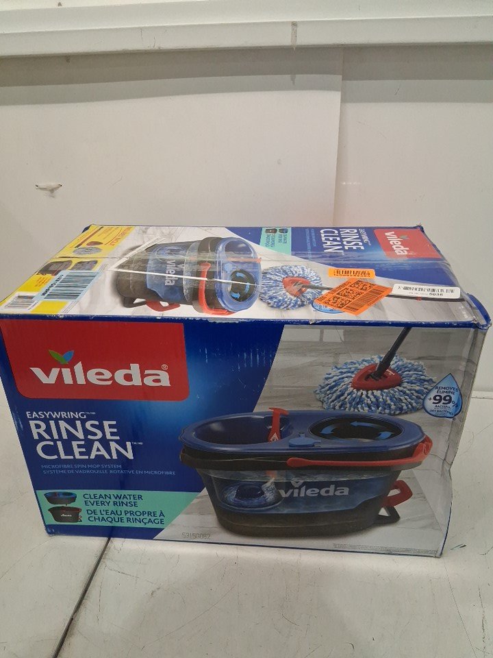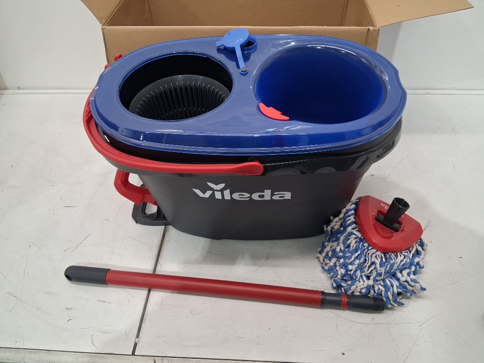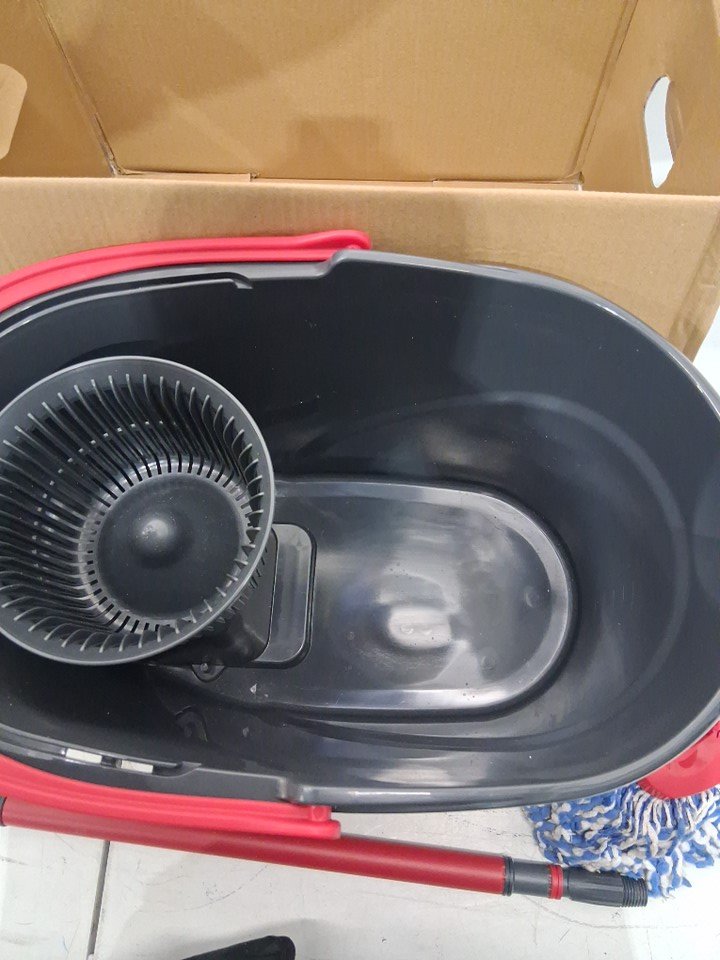 mop is visibly used, lightly discolored and has some hair/debris on it. Bucket has water spots