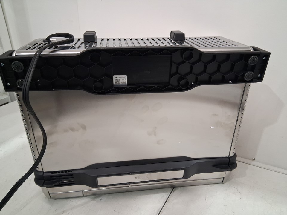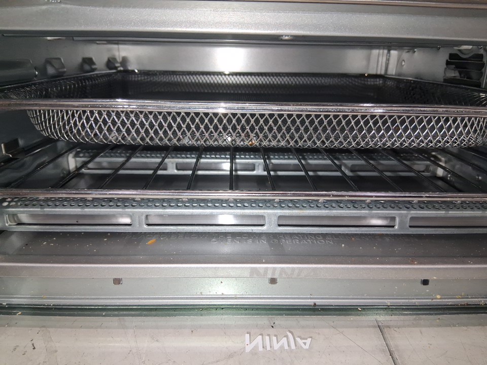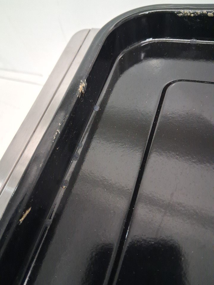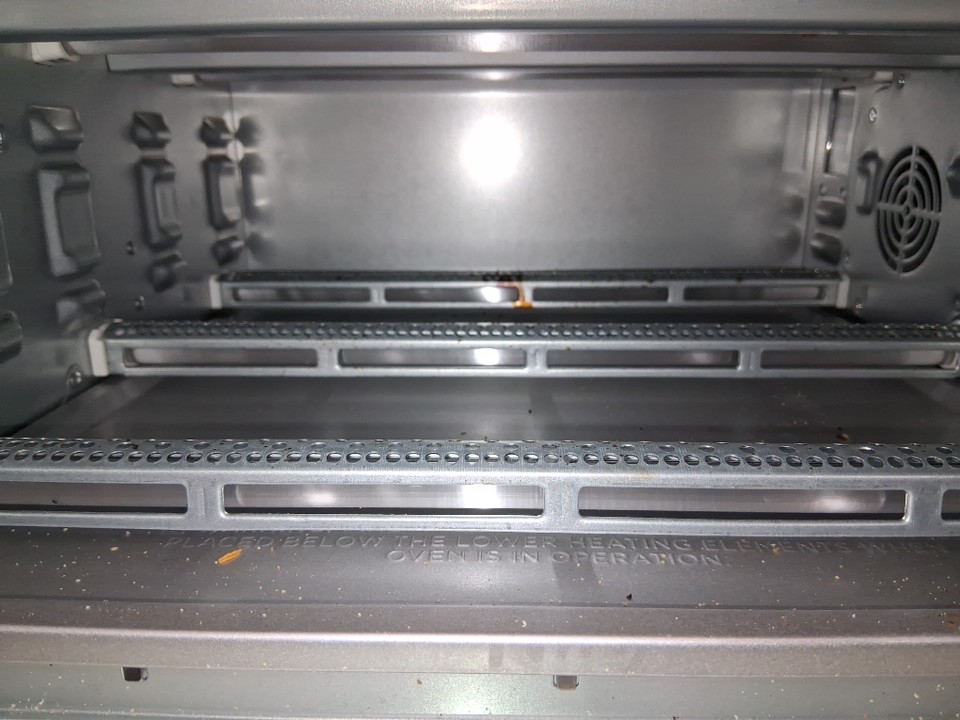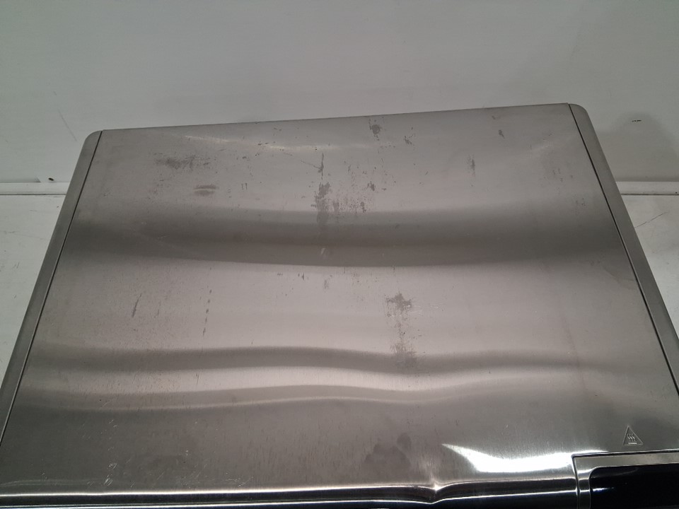 Tested for power, there are some fingerprint marks on the top of oven, a dent on the top as well and some food crumbs on the inside of oven the tray has some food stains as well, see all photos.