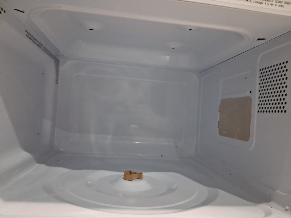 item has some light food residue on plate and inside of microwave from previous light use