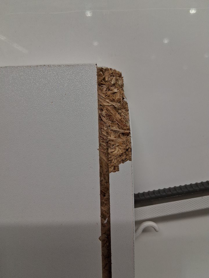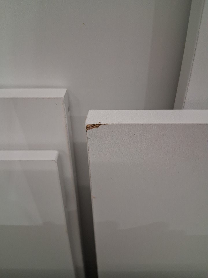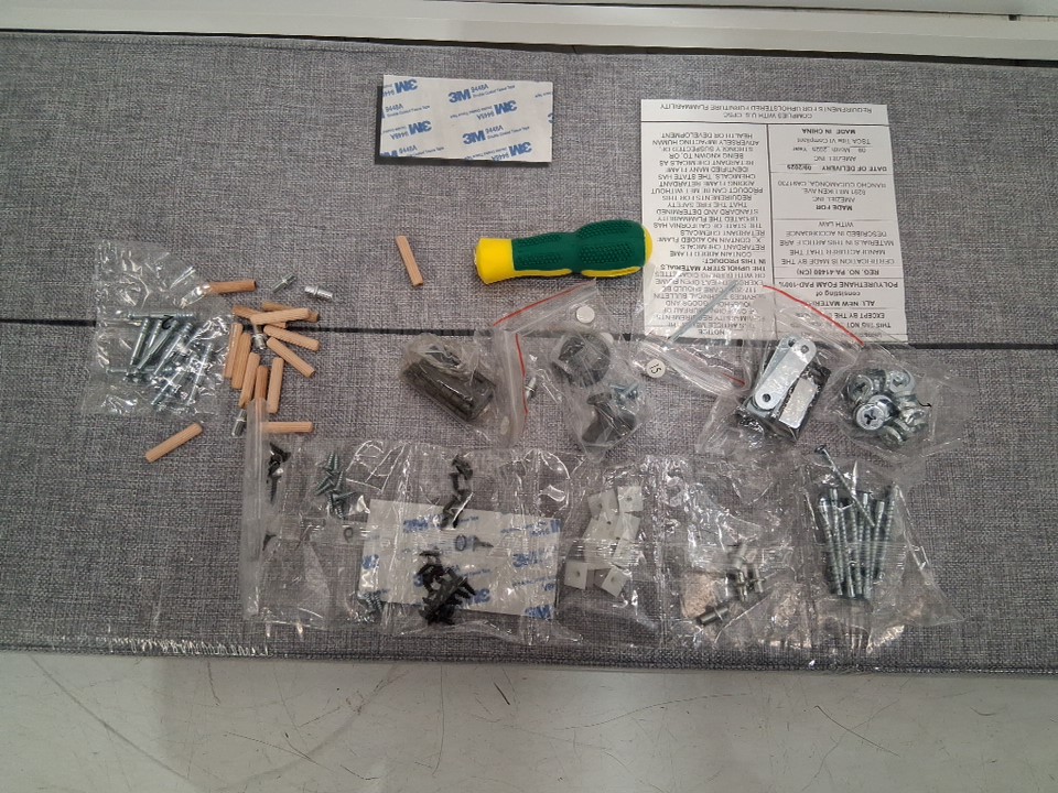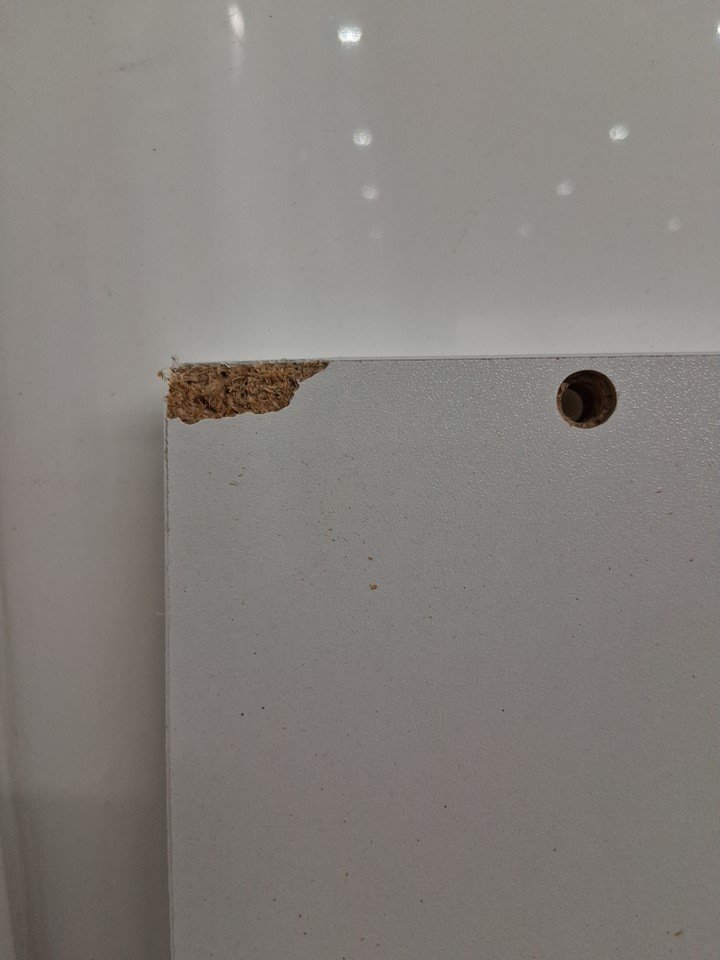 There are a couple of pieces with wood chips on the corners from previous use/shipping. Also, *the small piece to support the desk at the bottom is missing from the package*, you may not need to replace it, but the desk may be a little more unstable. Please note you may need some extra hardware as well as the bag arrived open. (please see photos)