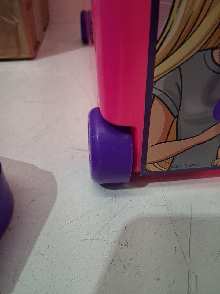One of the hinges is broken and the wheels/surface show some wear.