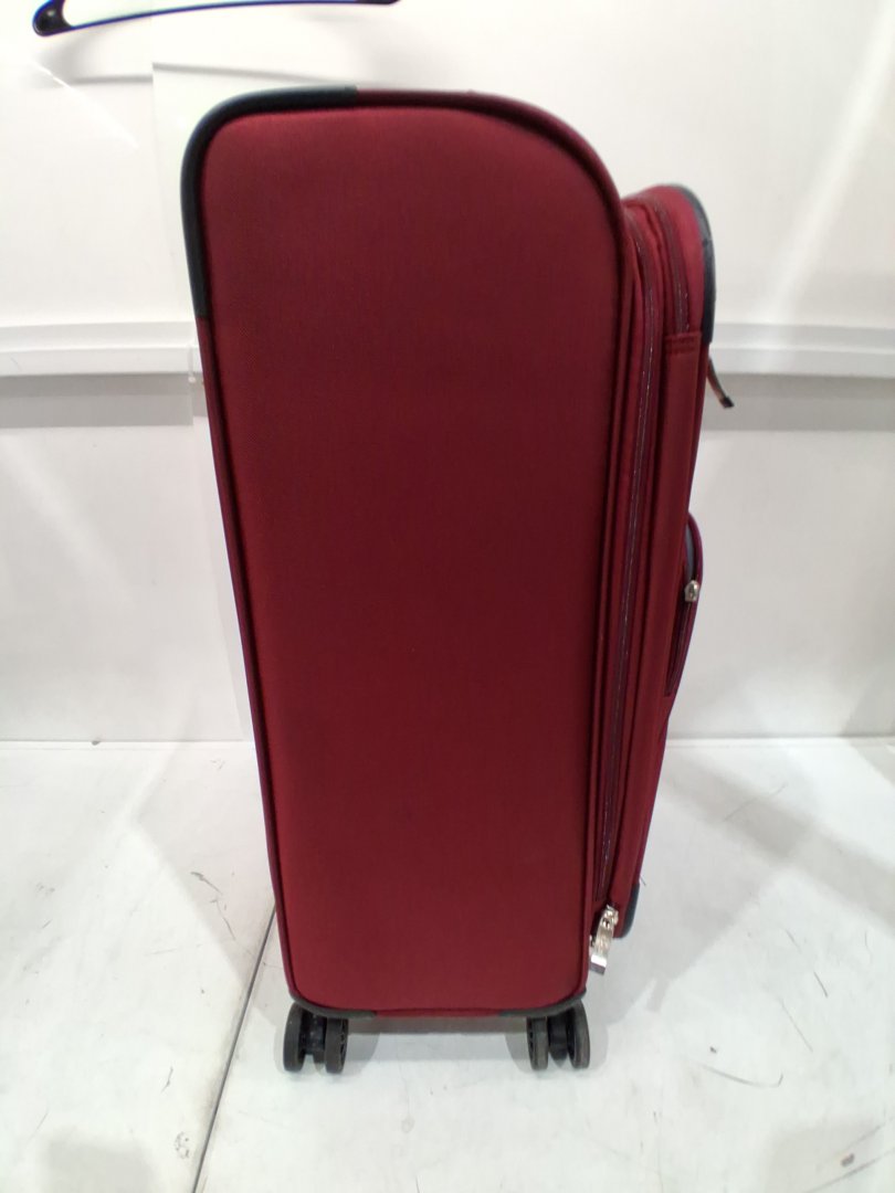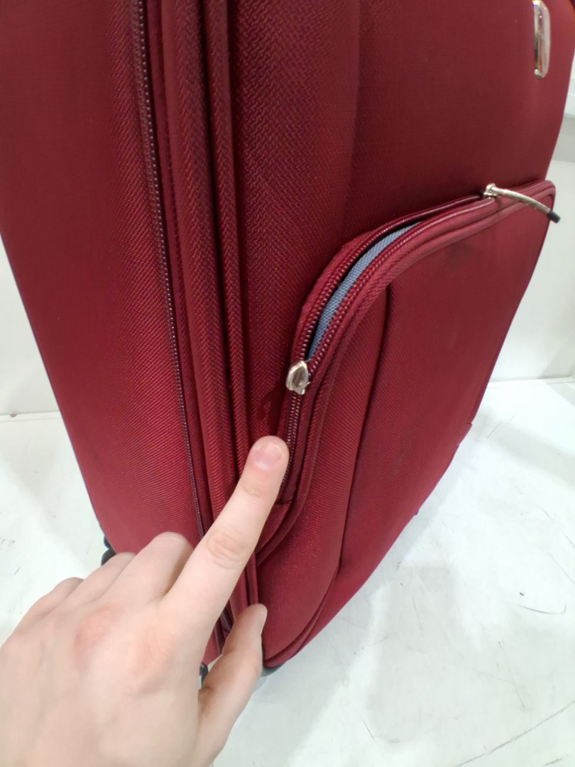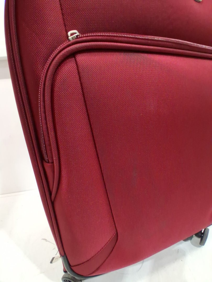 Item shows signs of previous use such as dark staining/markings on multiple spots of fabric, a missing tab for one of the front zippers, and mild dirt/dust on wheels.