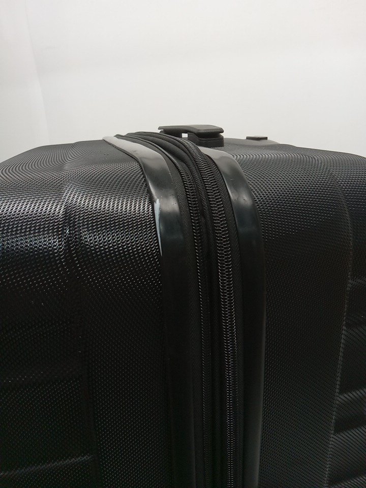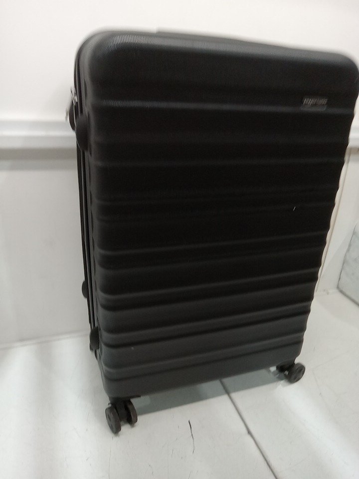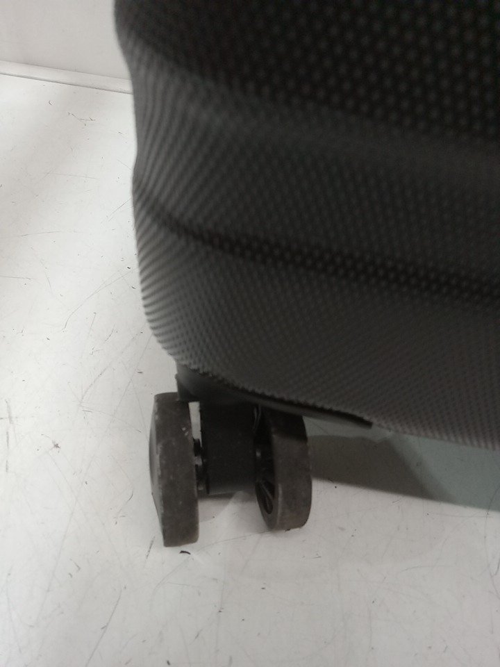 Dirt on the wheels and scuffs on the suitcase from previous use.