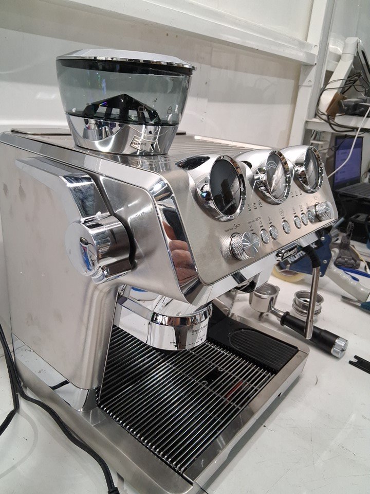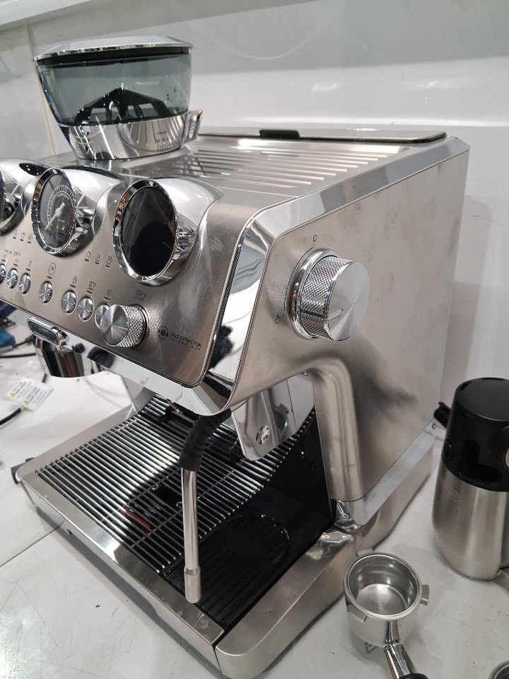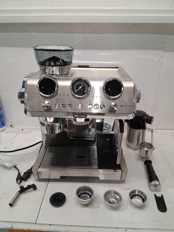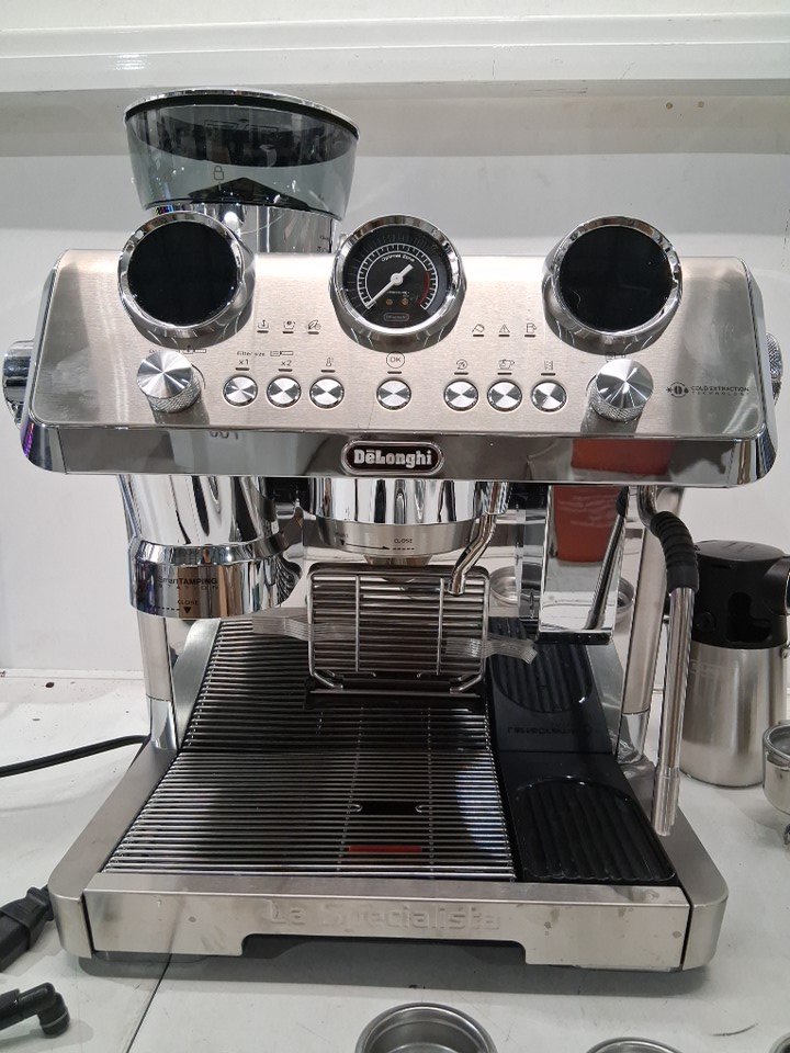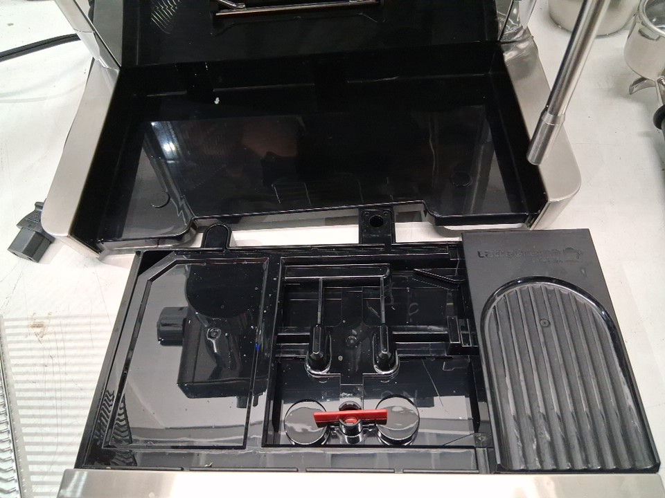 + The drip tray/lower part of the espresso machines frame is badly bent, the plastic underneath is cracked but the unit is still held together and the drip tray still slides in + + Item has residual coffee marks, grounds and stains around it + + Item has been tested for basic power only +