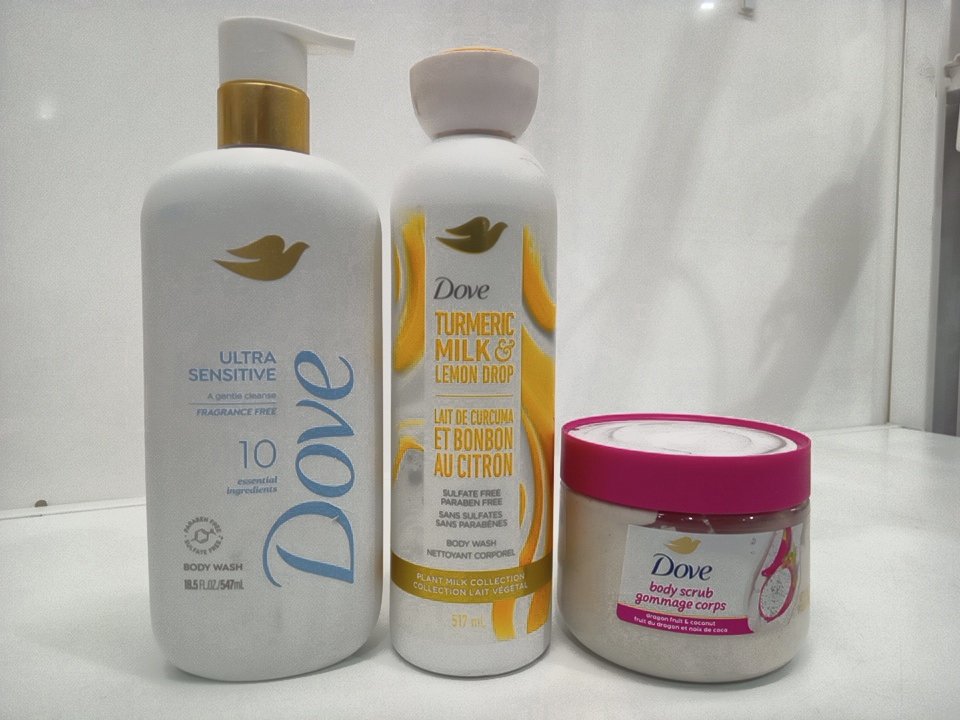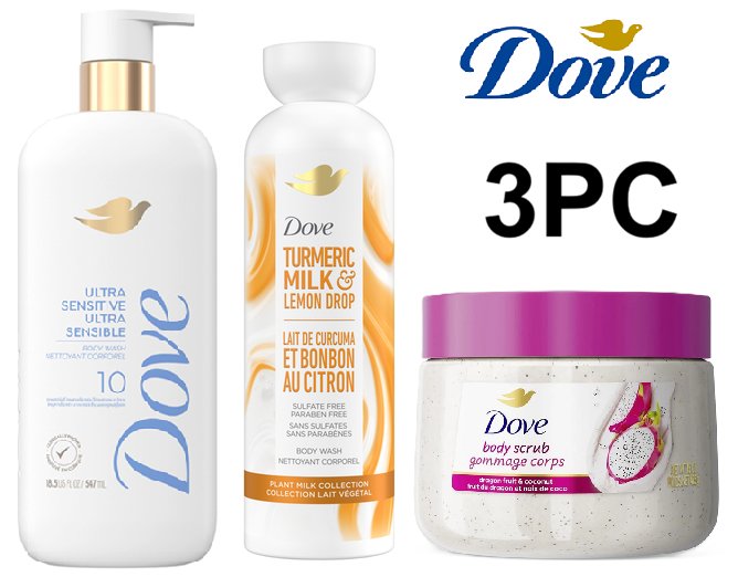 3PC DOVE ultra sensitive + turmeric milk & lemon bodywash & body scrub- 547ml/ 517ml/ 425g