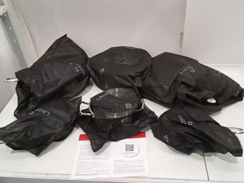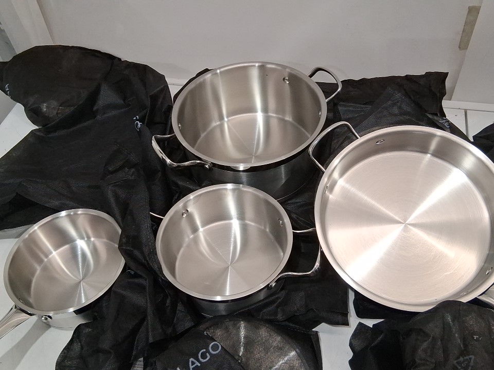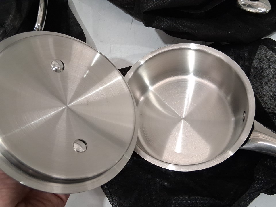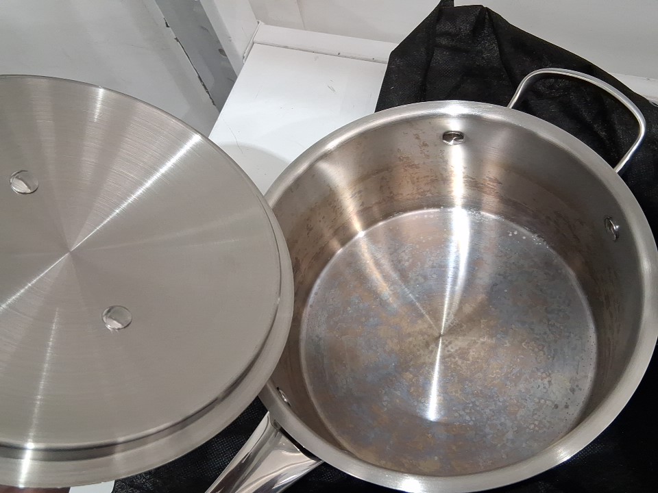 Item arrived with one of the pots showing signs of previous use; the other pots/lids appear clean/unused, see photos.