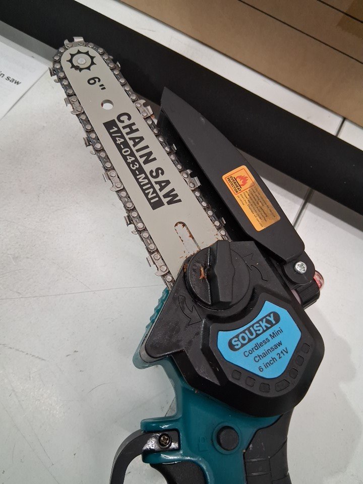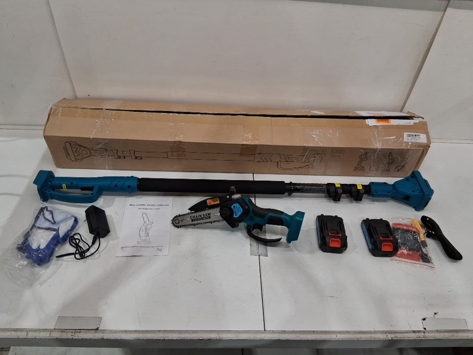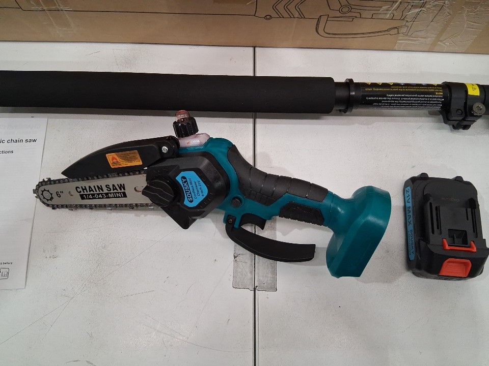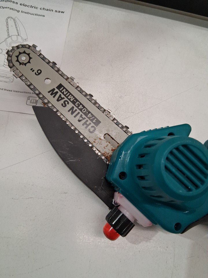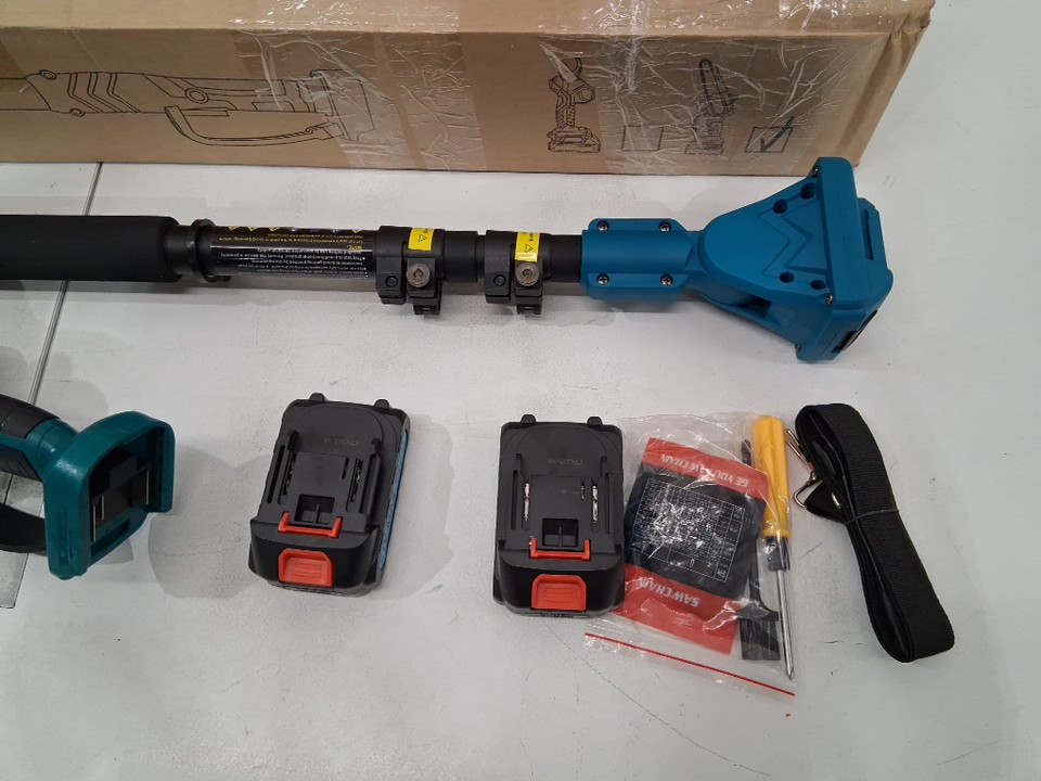 There is some dirt/sawdust on the chainsaw indicating previous use. Please note that the chainsaw was covered in oil at the time of inspection, but it is not clear if the chainsaw is leaking oil (see photos) Tested for power - both batteries and extension