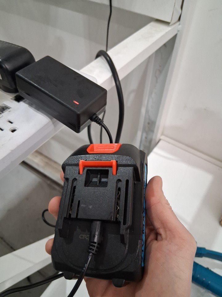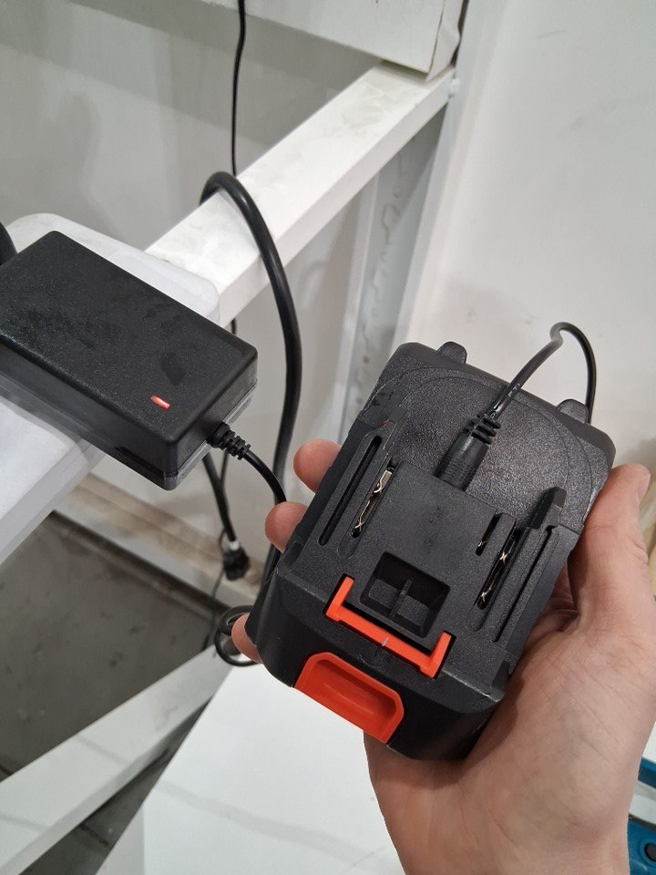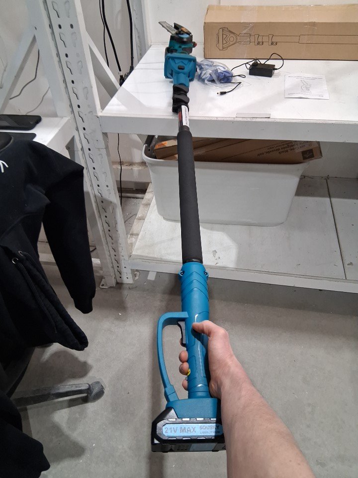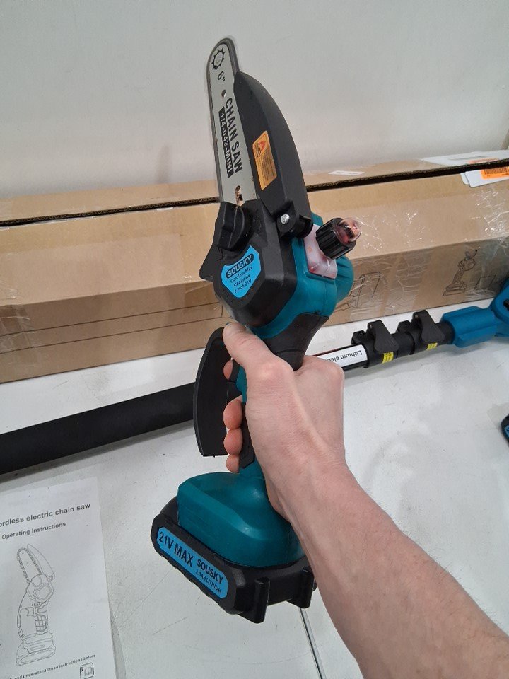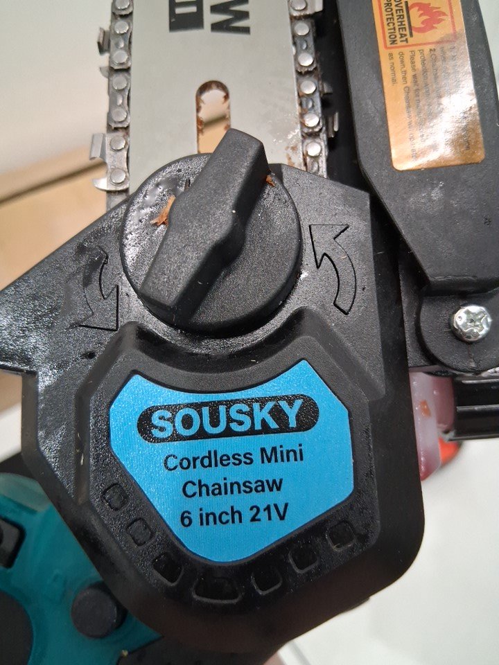 There is some dirt/sawdust on the chainsaw indicating previous use. Please note that the chainsaw was covered in oil at the time of inspection, but it is not clear if the chainsaw is leaking oil (see photos) Tested for power - both batteries and extension