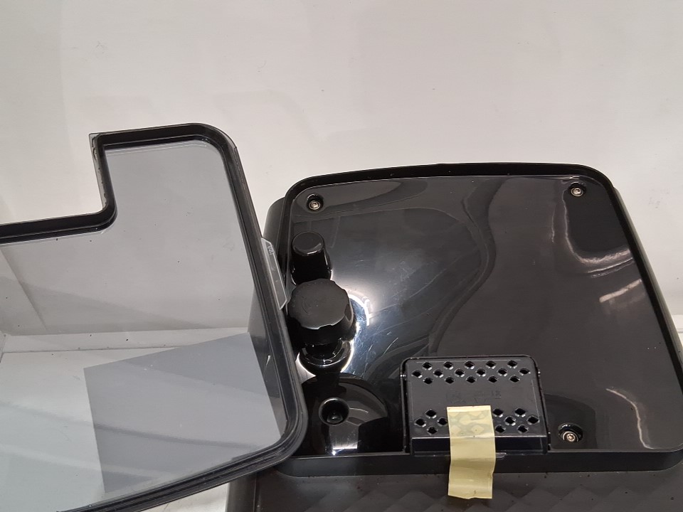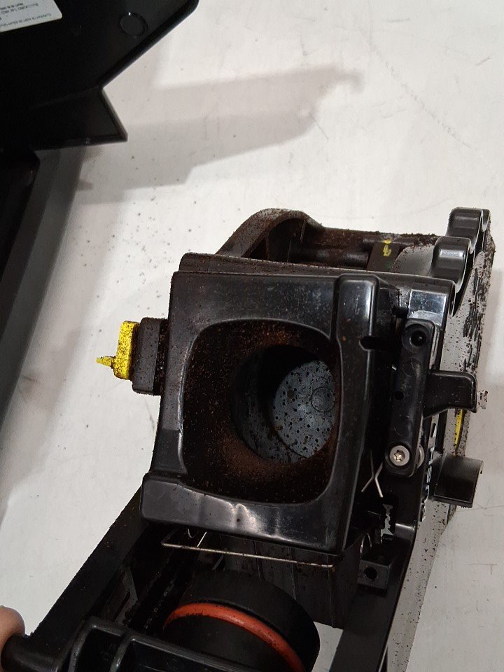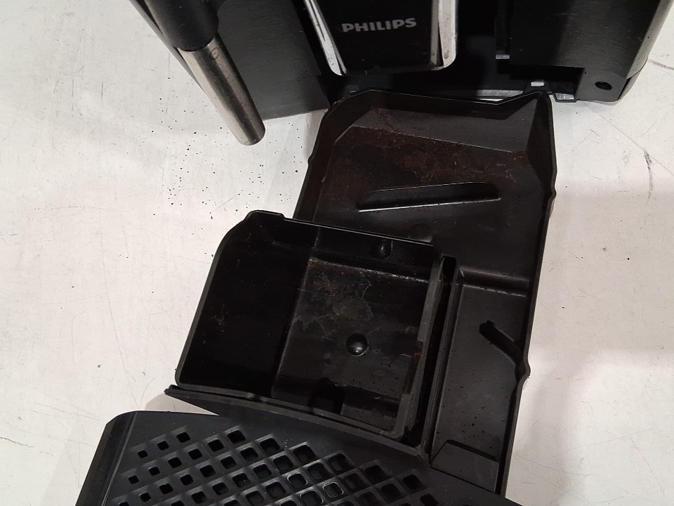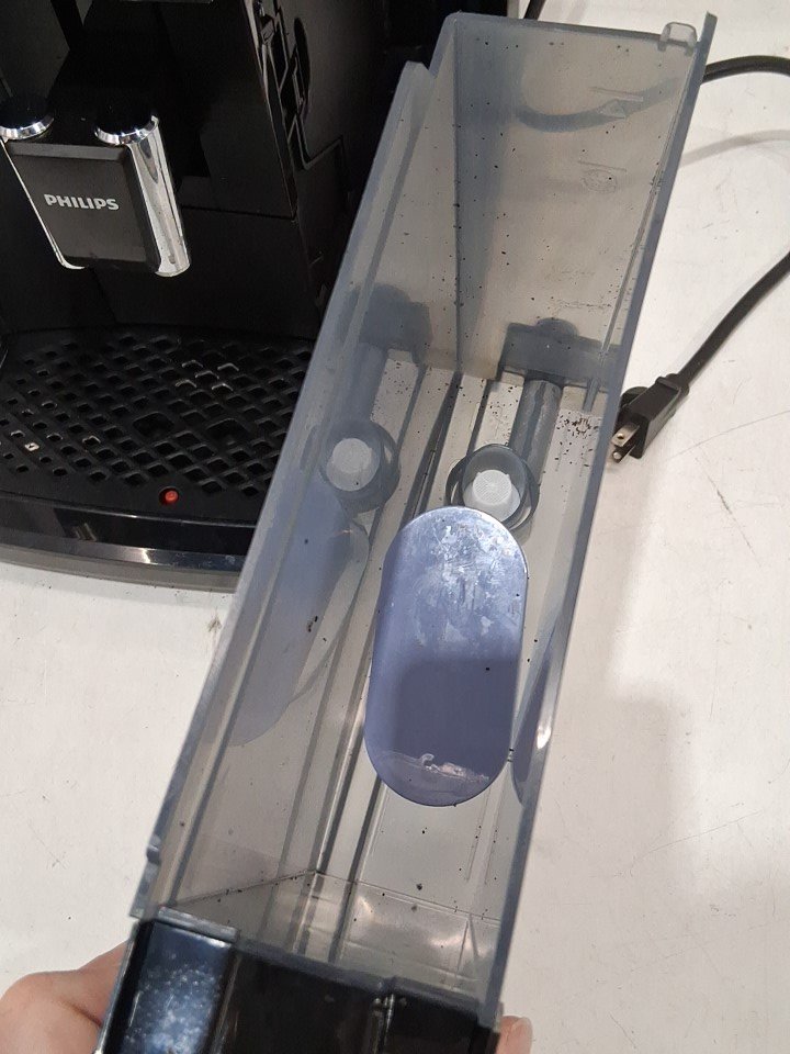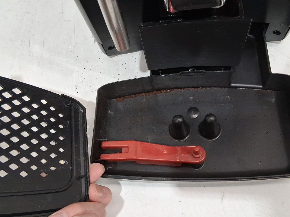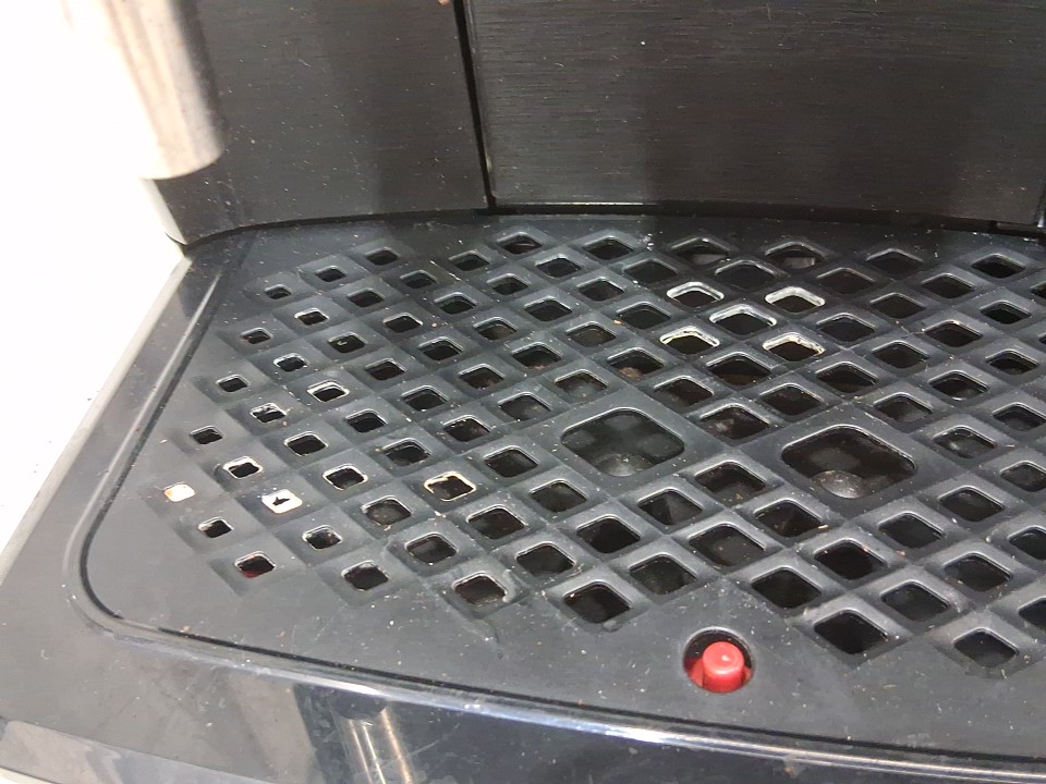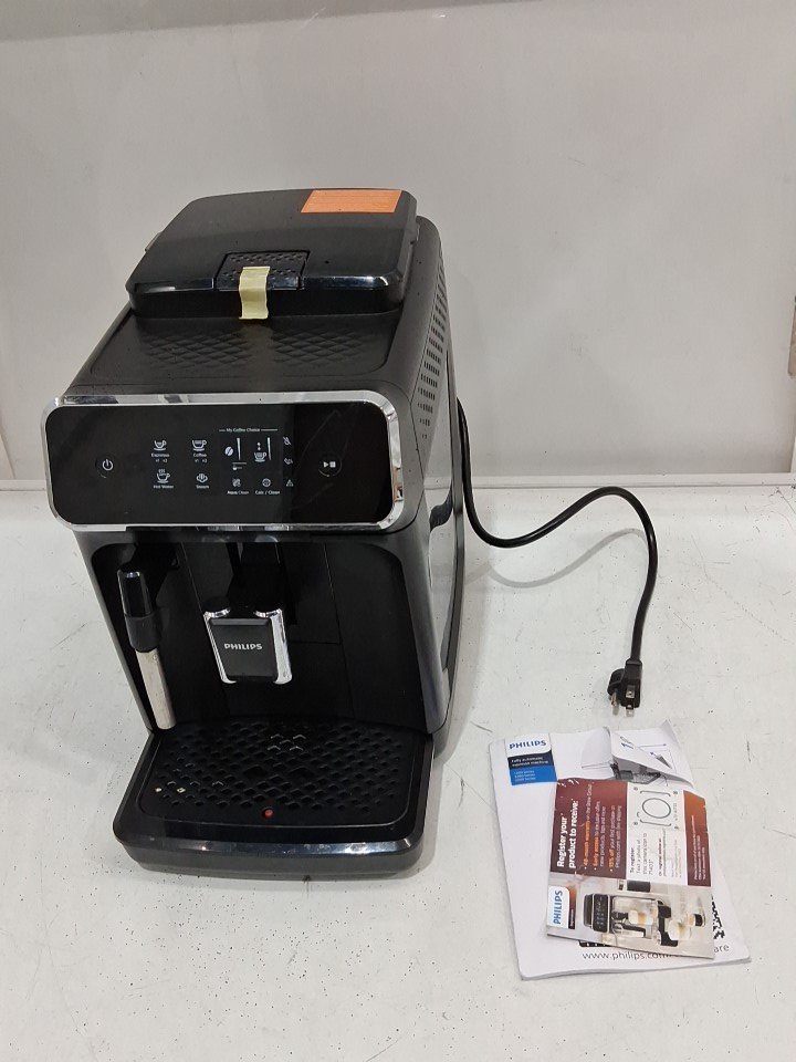 **Tested for power.** Item has coffee grounds debris throughout, a few coffee stains/markings in the drip tray, does not include a measuring scoop, grease tube, or water hardness test strip from previous gentle use, see photos.
