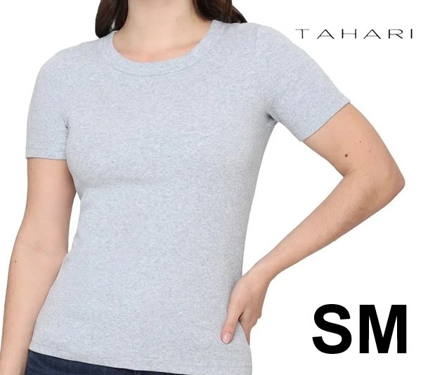 Women's Tahari Ribbed Cotton Short Sleeve T-Shirt - SMALL- Grey (Style: 2868740)