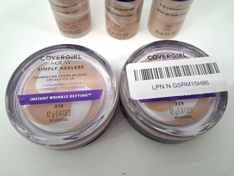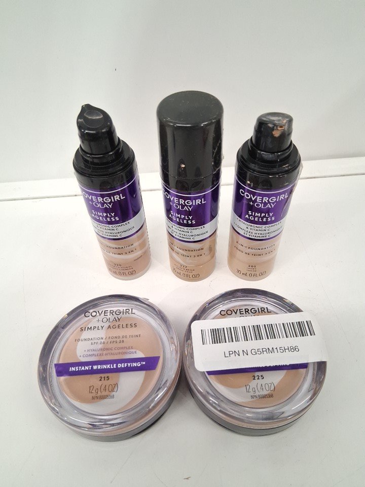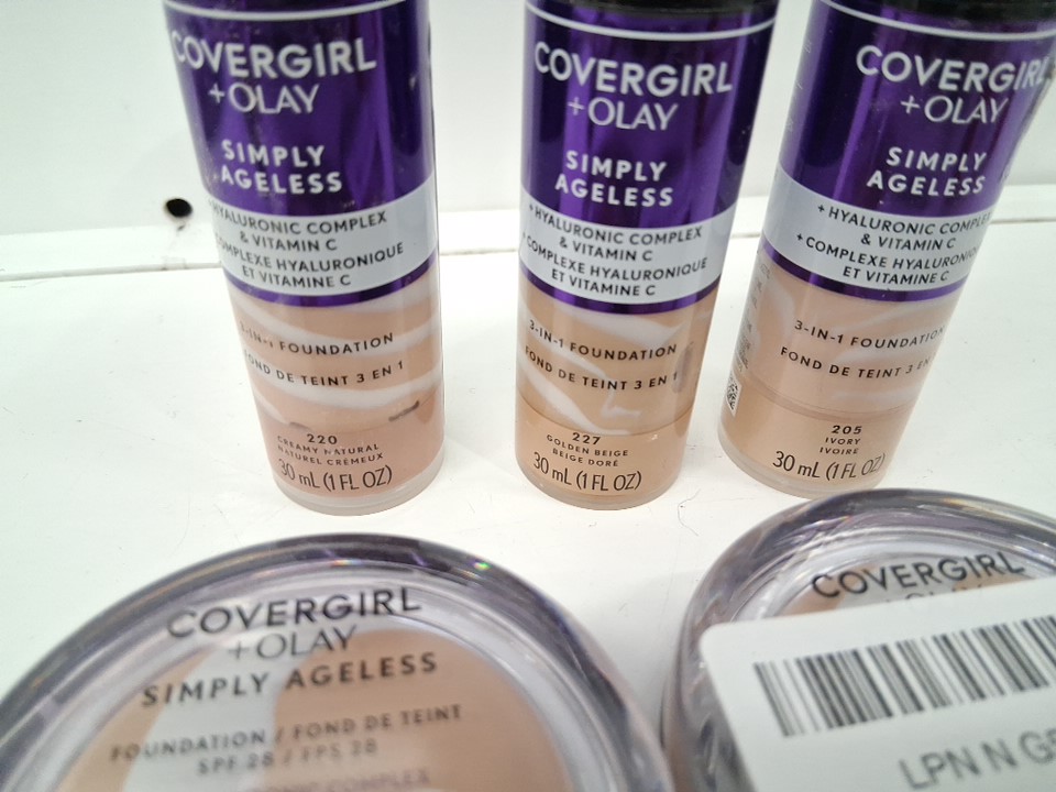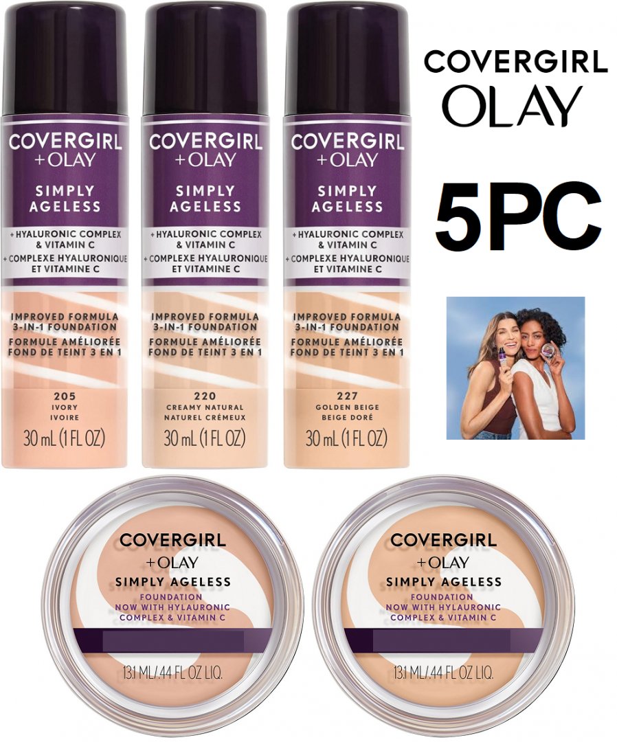 5pc covergirl olay Simply Ageless Liquid Foundation Infused with Hyaluronic Complex, Vitamin C and Niacinamide - assorted shades and sizes - 205 ivory / 220 creamy natural / 227 golden beige / 215 / 225