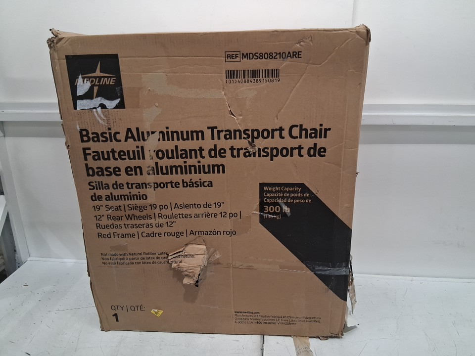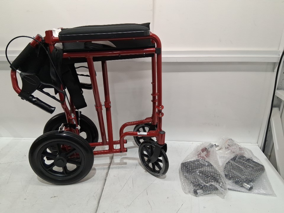 MEDLINE BASIC ALUMINUM TRANSPORT WHEELCHAIR - 19" - 12" REAR WHEELS WITH BRAKES - 300lbs capacity - RED (MODEL: MDS808210ARE)