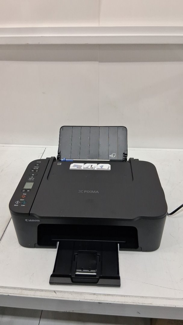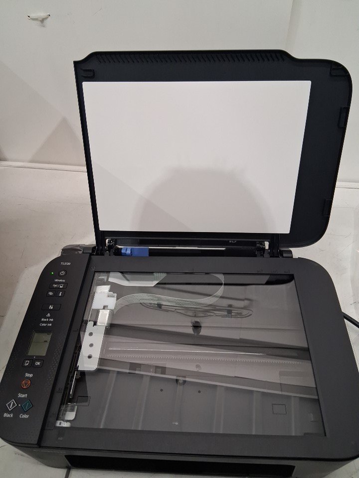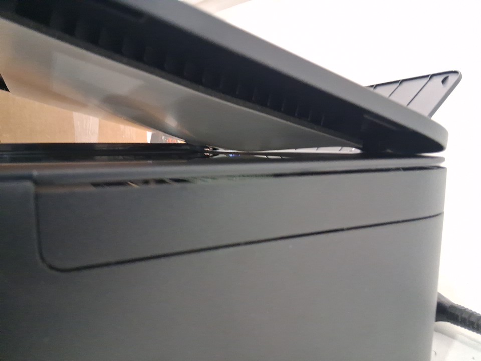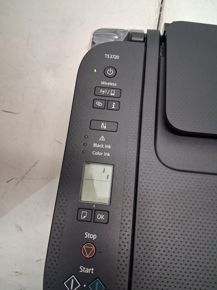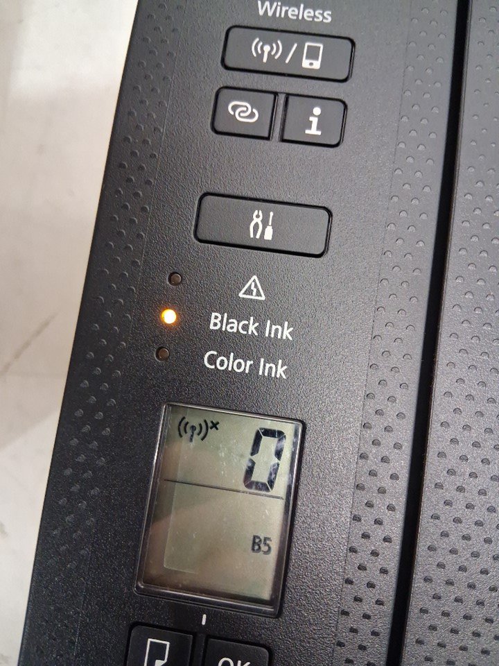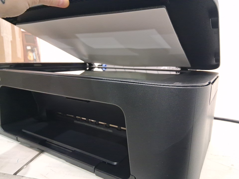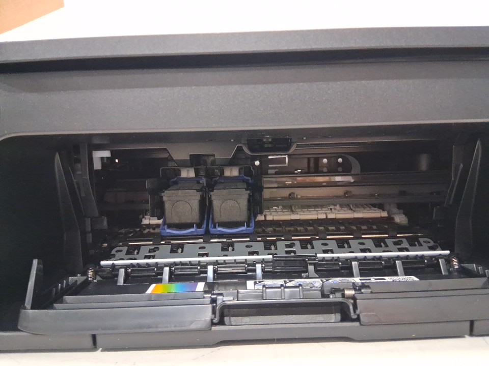 Cartridges are previously installed, and black ink is low. Part of casing near scanner, has popped out and will need to be pushed back in. Has been tested for power only