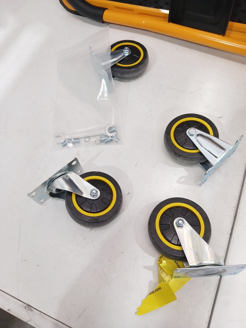item has minor chips in the paint and some dirt on the wheels from previous use