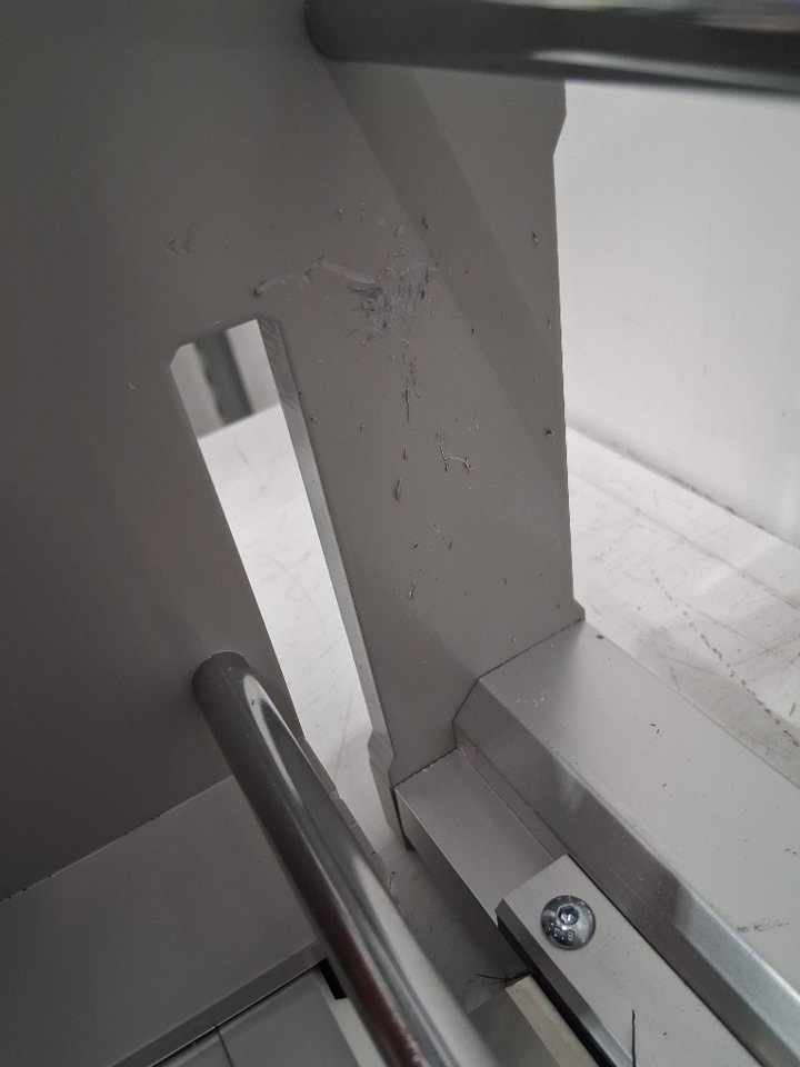 There are a couple of paint chips/scratch marks from previous use, and the blade also had a bit of dust on it due to previous cutting.