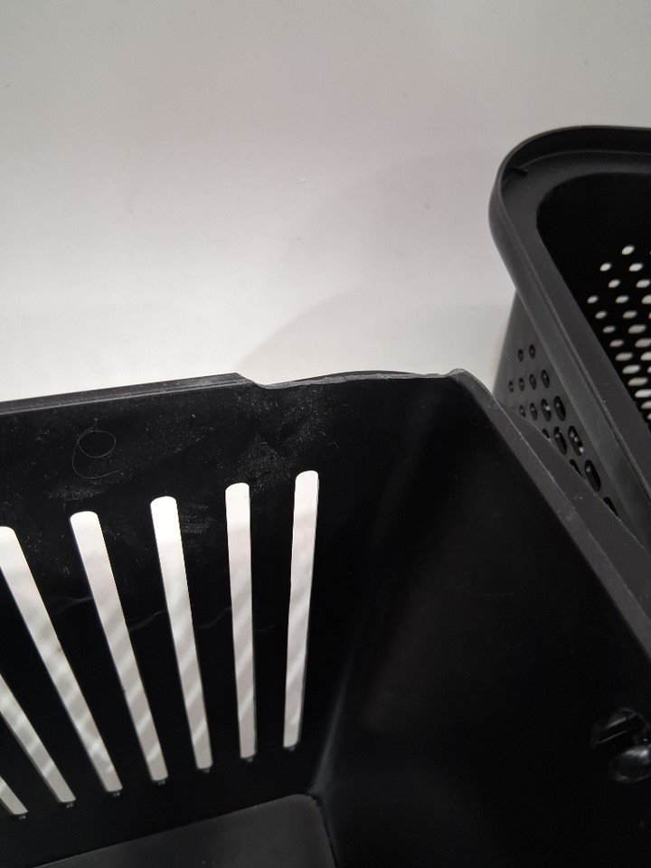 The basket with the handle has a damaged edge a the top.
