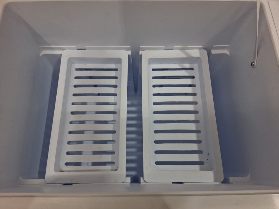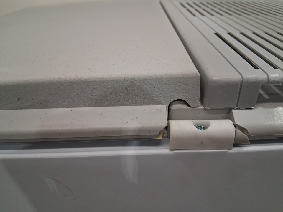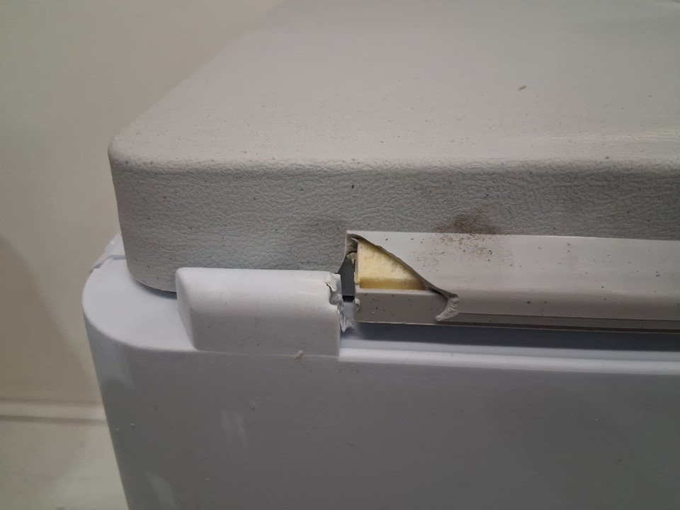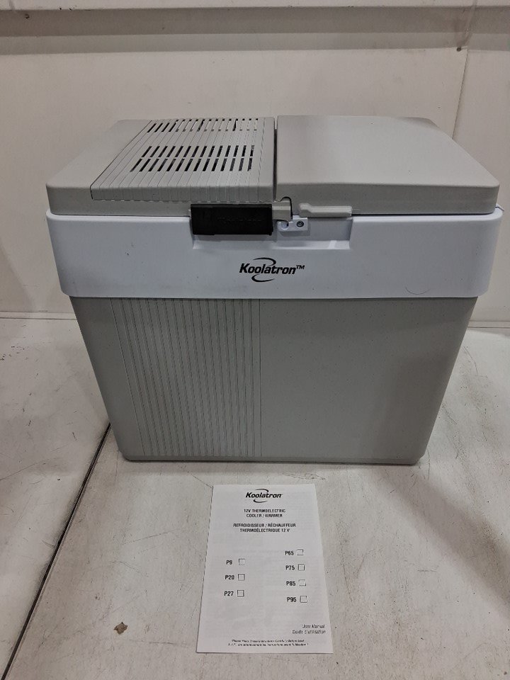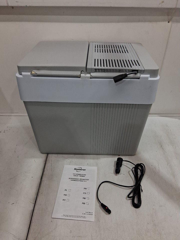 Item tested for power. Item has marks and scuffs from previous use. Also, the lid's hinge is broken. (See photos)