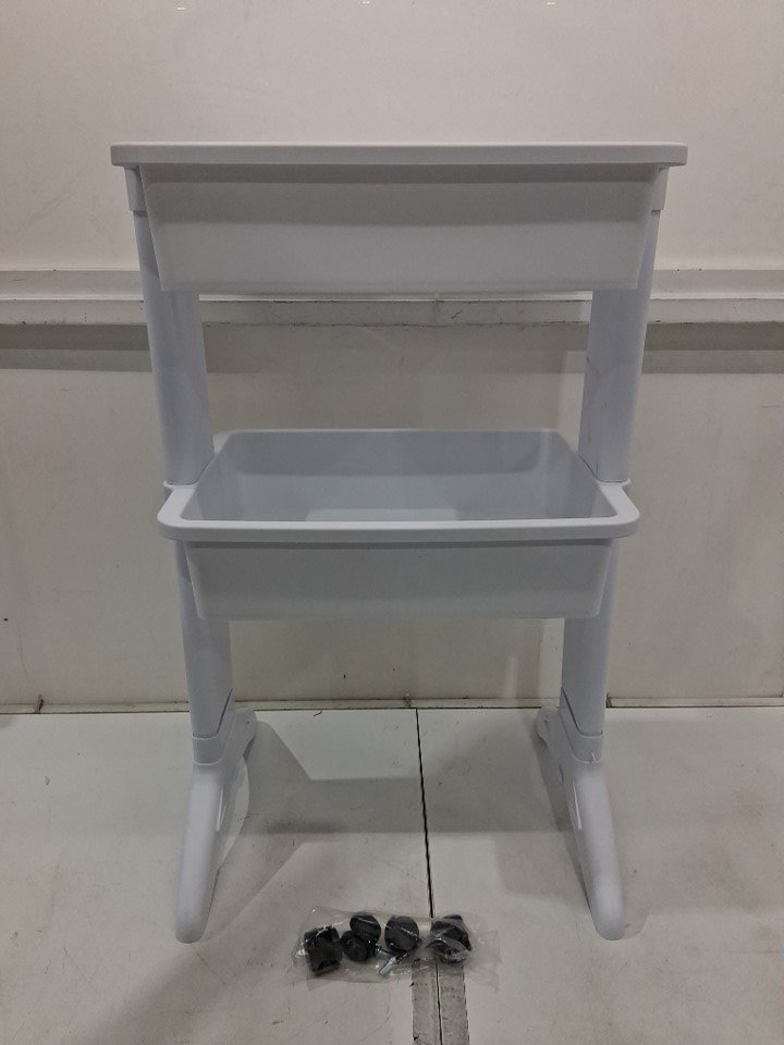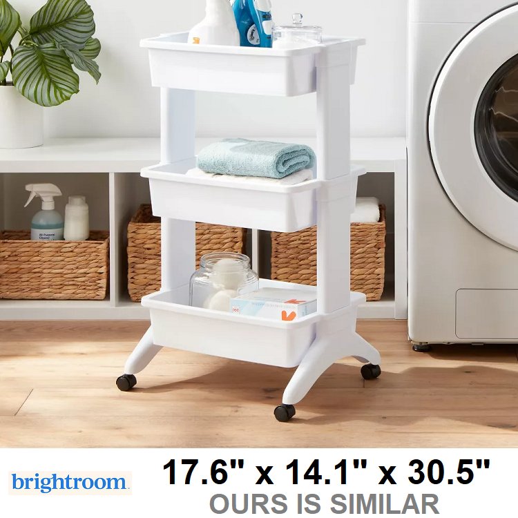 There are some scratches/scuff marks on the pieces from being shipped without sealed packaging. Please note that this is suppose to be a 3-tier cart, but one of the bins is missing - can still be assembled/used with 2 bins (see photos)