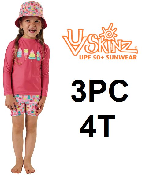 3pc Toddler girl's UV Skinz UPF 50+ Swim Set - hat, shirt, shorts - 4t - pink / ice cream (style: 8072777)