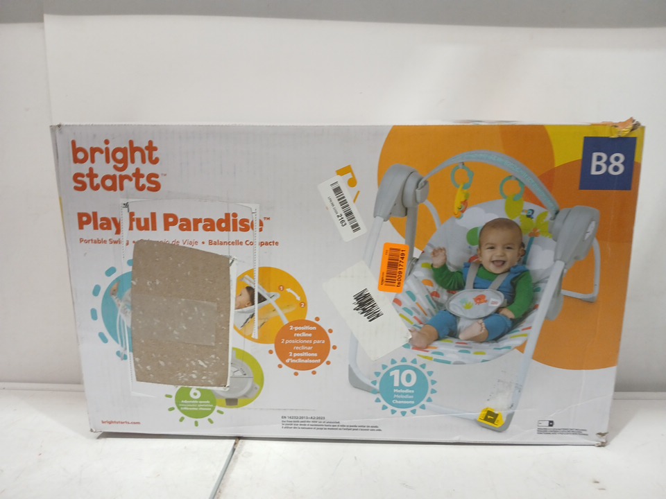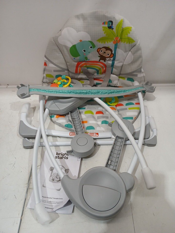 BRIGHT STARTS PLAYFUL PARADISE COMFY PORTABLE 3-POINT HARNESS VIBRATING BOUNCER WITH TOY-BAR - MULTICOLOUR (MODEL:‎13070 )
