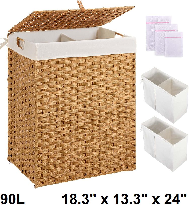 Greenstell Rattan Laundry Hamper with 2 Removable Liner Bags - 90L -18.3" x 13.3" x 24" - Brown(Model: LH004-05)