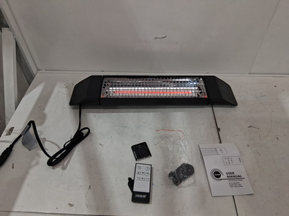 please note that the heater has some scratches on the bottom part and tested for power, working. missing hardware (see photos).