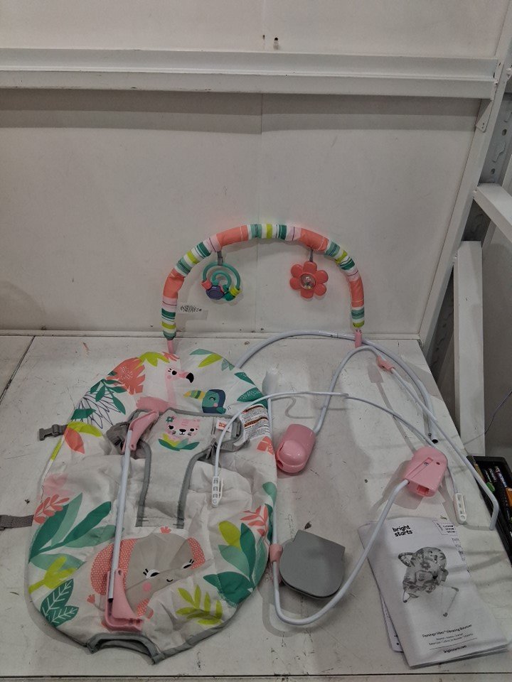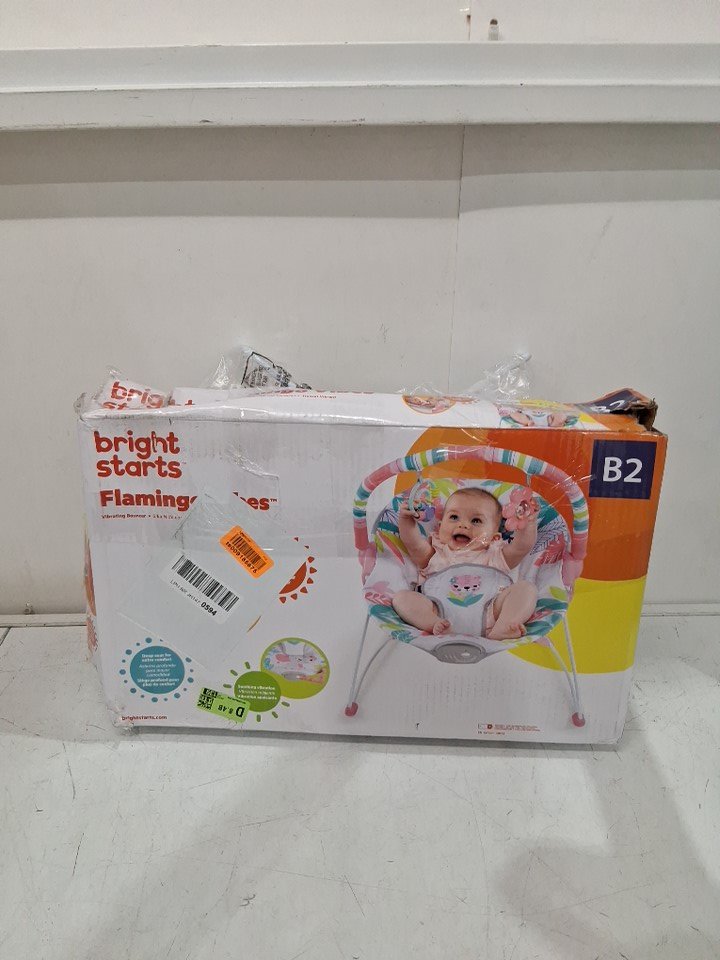 BRIGHT STARTS 3-POINT HARNESS VIBRATING BABY BOUNCER WITH TOY BAR - FLAMINGO VIBES (MODEL: 12228-ES)