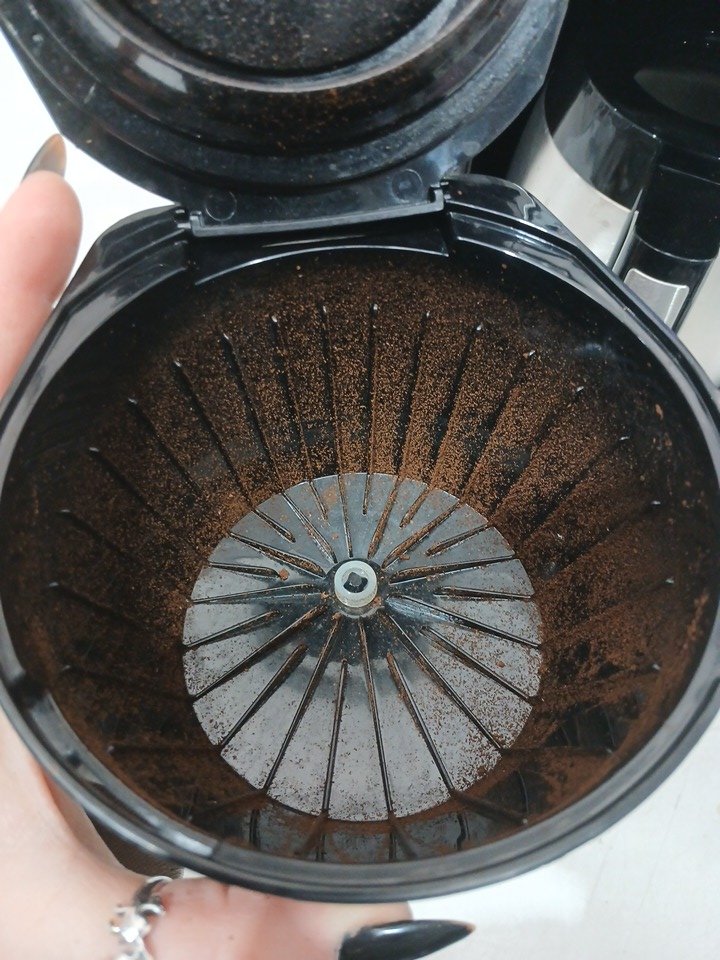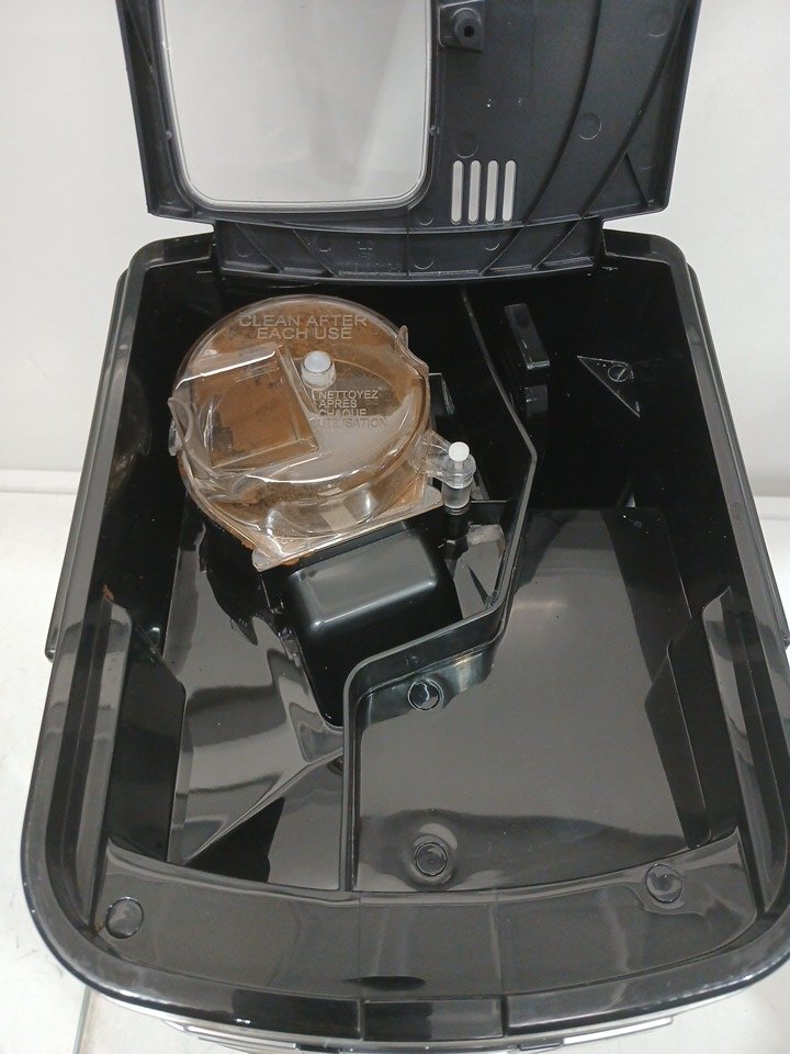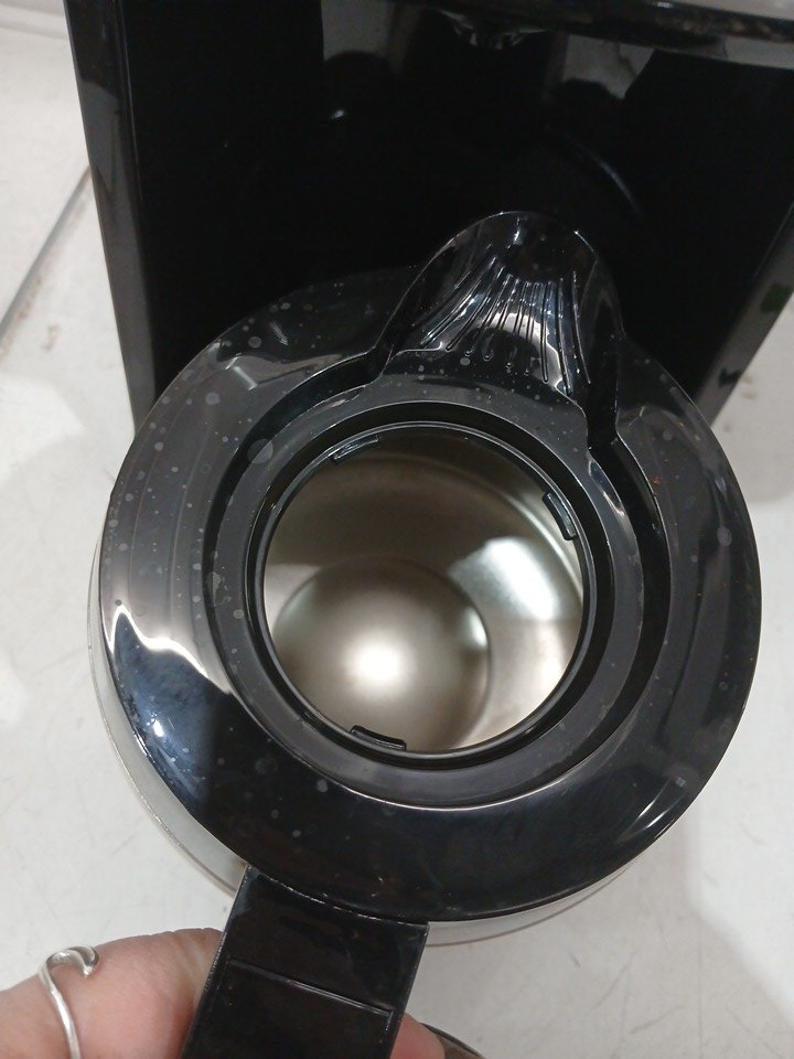 there is coffee residue & water spots present due to use. missing the carafe lid (replaceable)