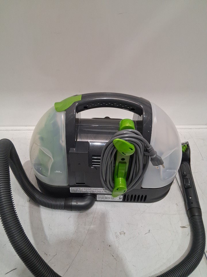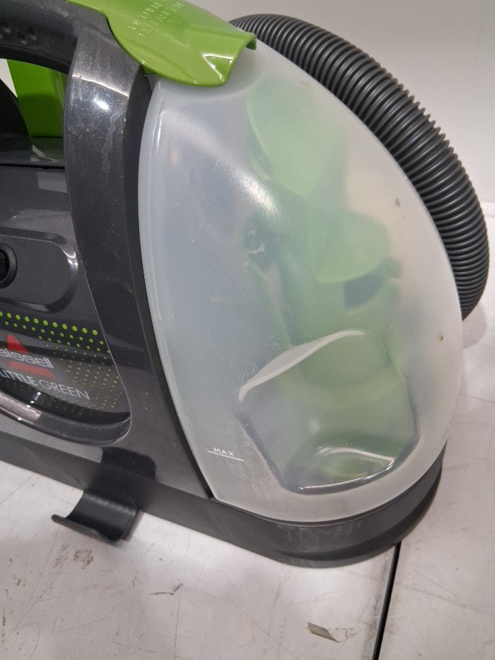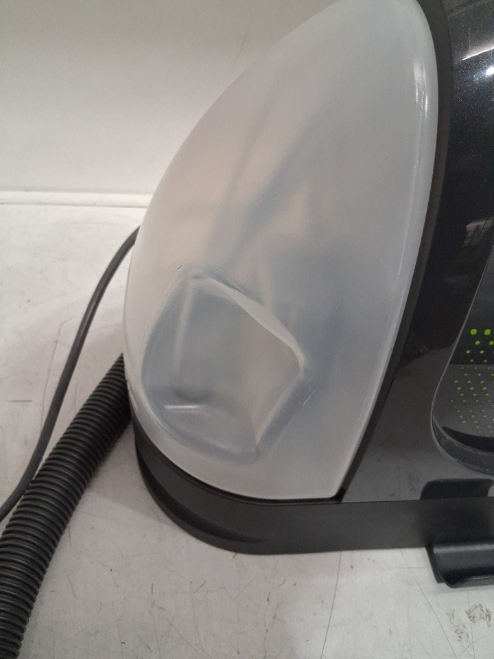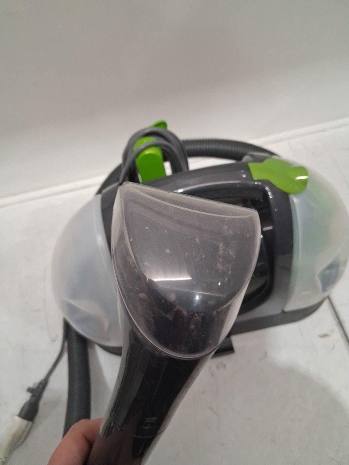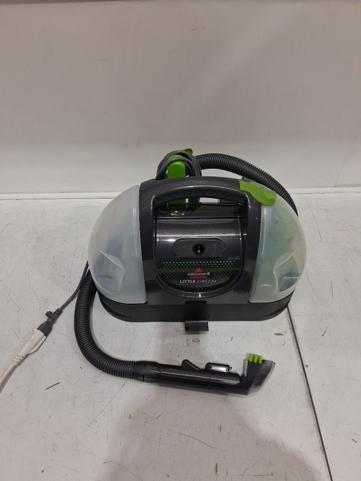 Tested for power, working. Signs of light use, dirt/debris on cleaning head. Moisture/debris inside water tanks. Missing the bottle of cleaner