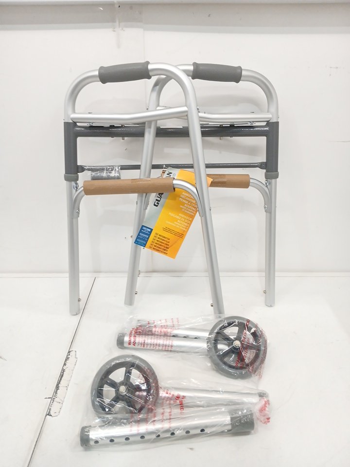 Medline Two-Button Folding Walker with Wheels - 32" to 38" - Silver/Grey (Model: MDS86410JW54)
