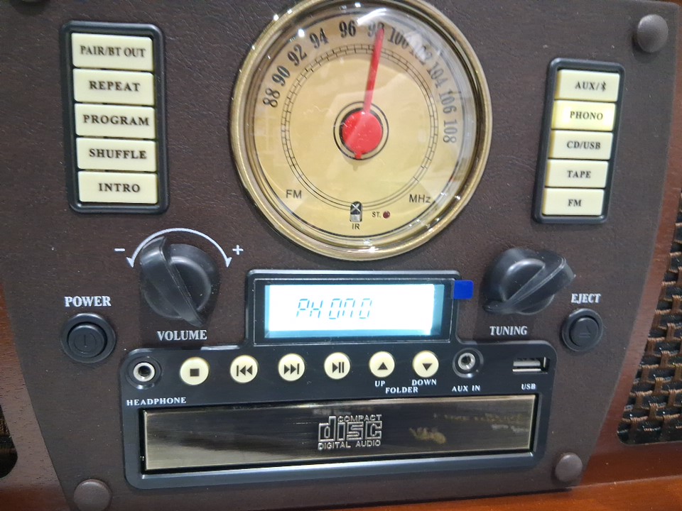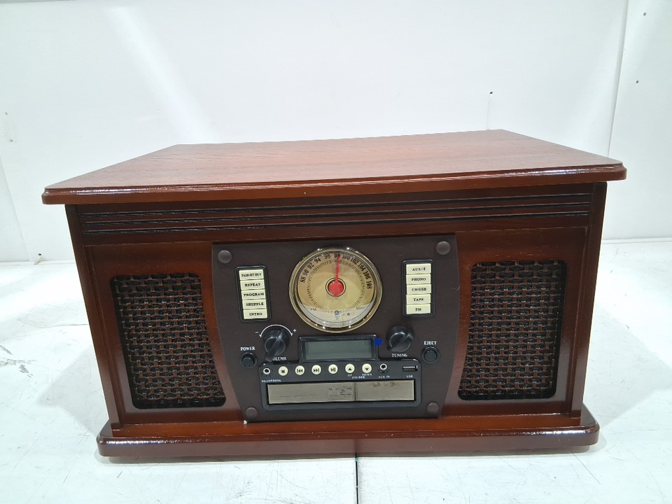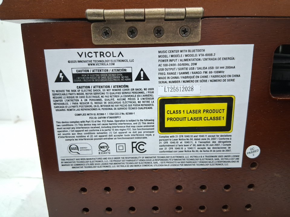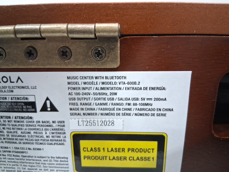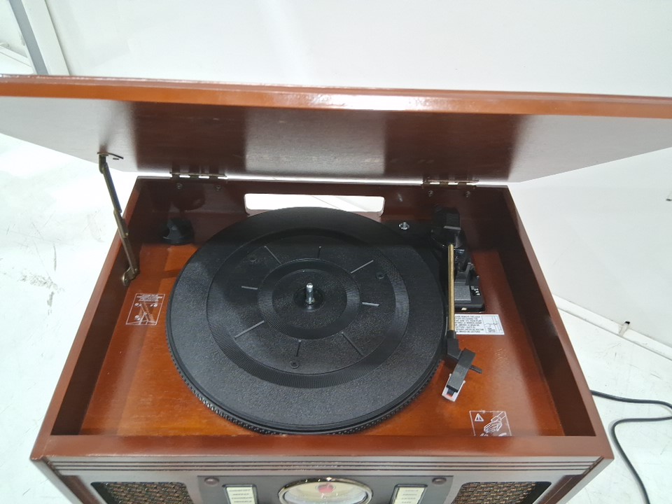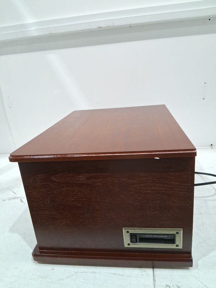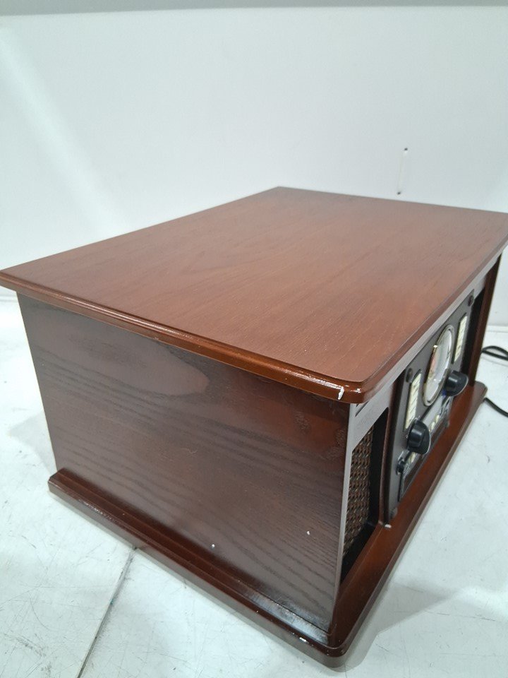 Please note that the black top frame of the vinyl player is loose and not properly attached to the unit. However, the vinyl player functions correctly with no performance issues. The frame may require a screw or adhesive, as it is currently loose. Tested for power and functionality. (Please see photos)
