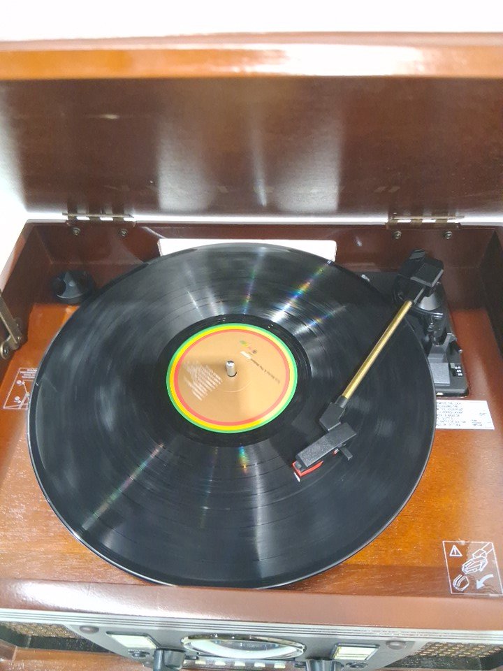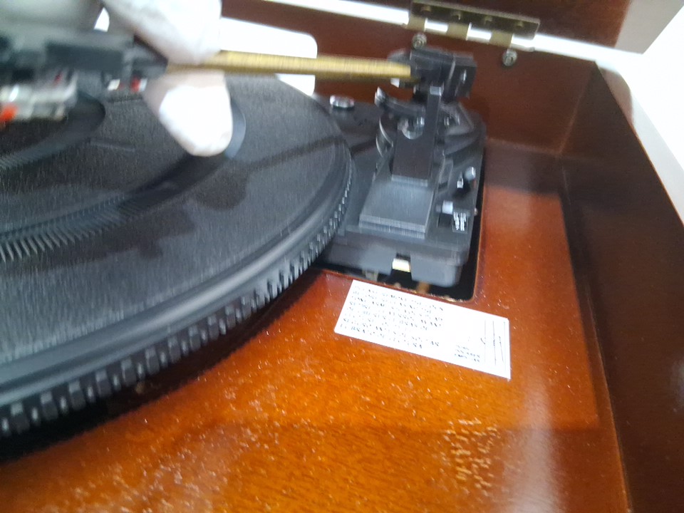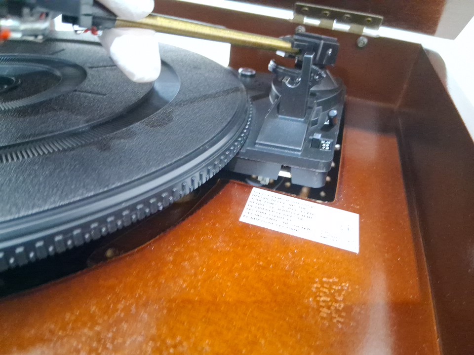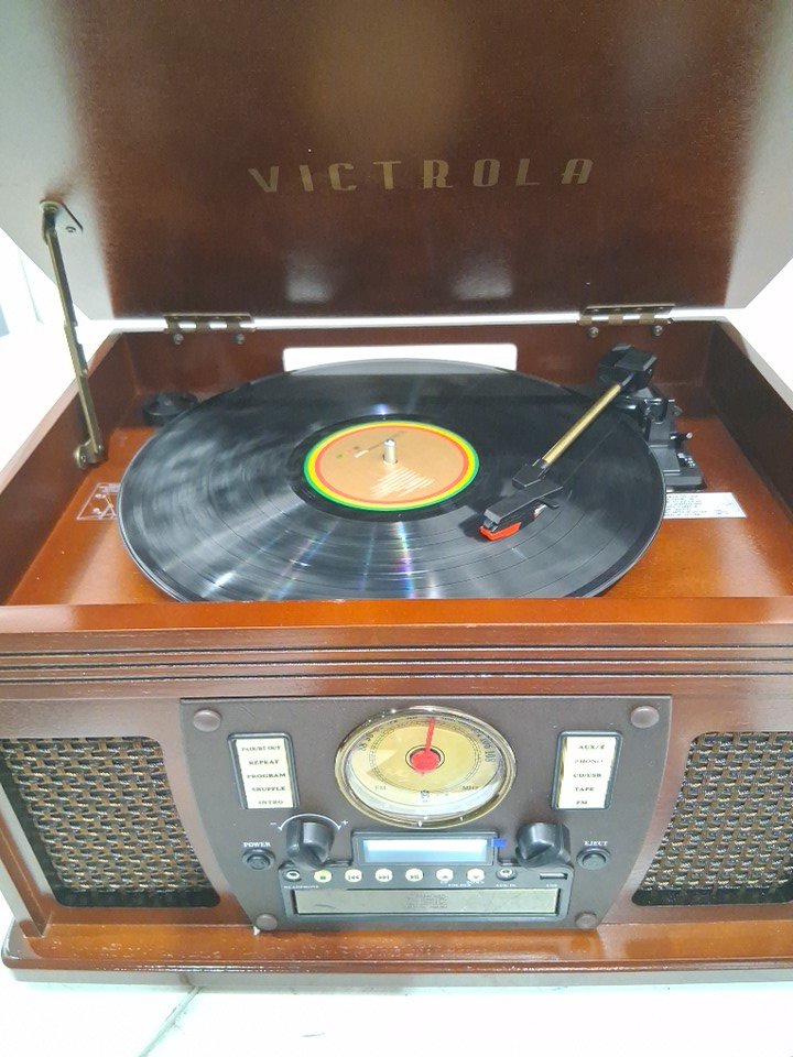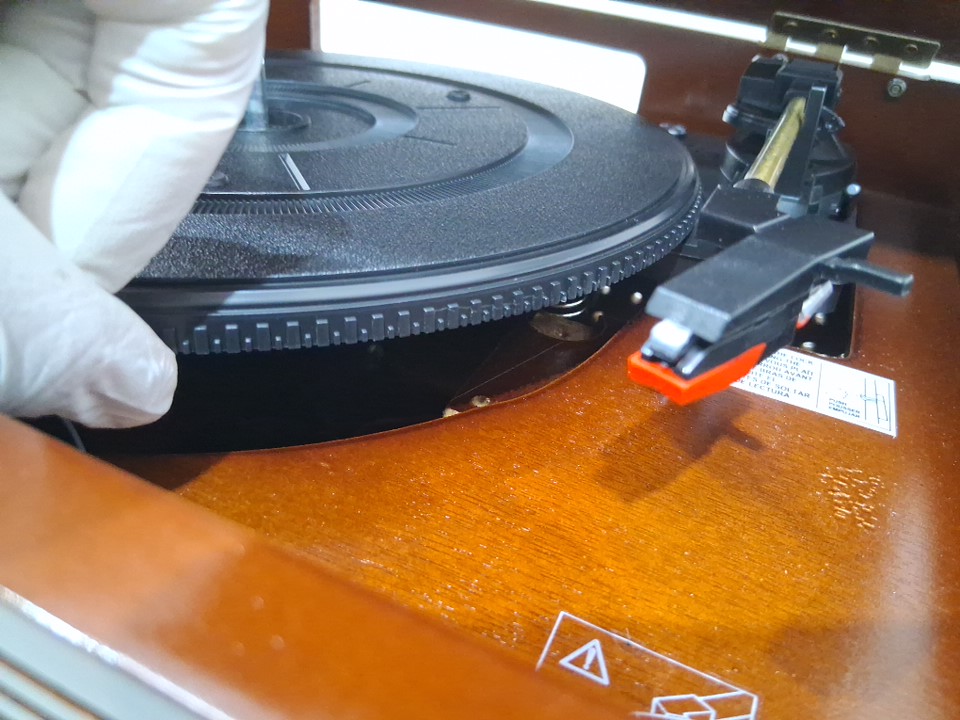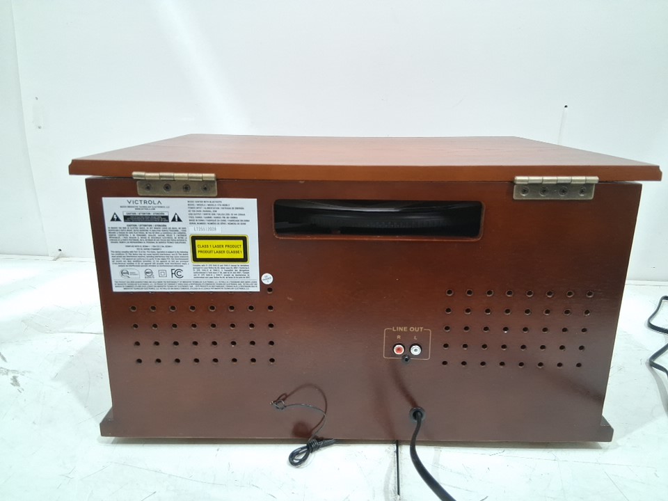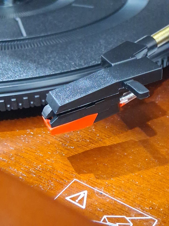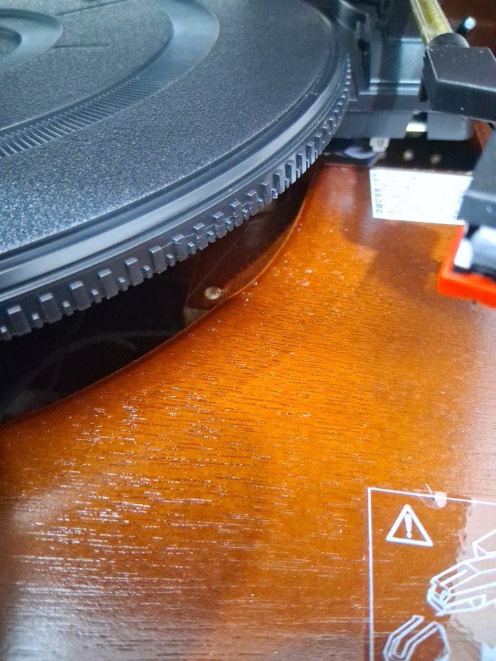 Please note that the black top frame of the vinyl player is loose and not properly attached to the unit. However, the vinyl player functions correctly with no performance issues. The frame may require a screw or adhesive, as it is currently loose. Tested for power and functionality. (Please see photos)